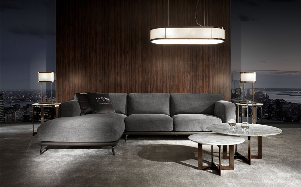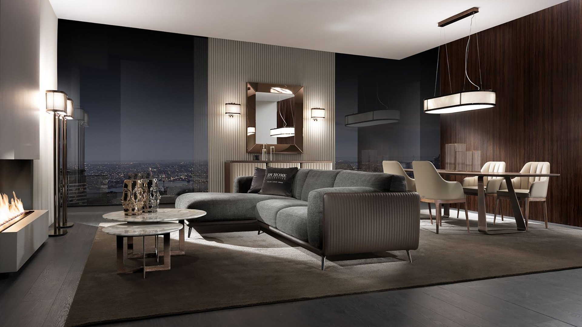 Corner sofa Elite - a modern sofa has rounded shapes and strong metal supports. The back is upholstered in leather and the armrests have decorative stitching, which gives an elegant look.