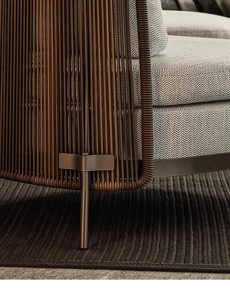 Here, the couture detail of Tape - the piece of ribbon that holds the feet on to the body - takes the form of a metal plate in Bronze colour, a finish that is the leitmotiv of all the outdoor seats of the 2019 Collection.