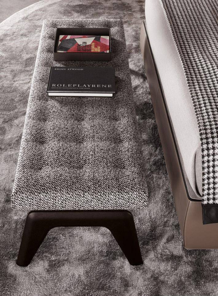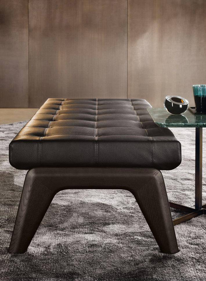 Коллекция Kirk включает в себя мягкую скамью с деревянным основанием длиной 138,5 и 183,5 см. Версии из кожи и бархата имеют стеганый эффект с верхней строчкой, создающей геометрический узор из квадратов, а версия с тканевой обивкой имеет утонченный стеганый дизайн.