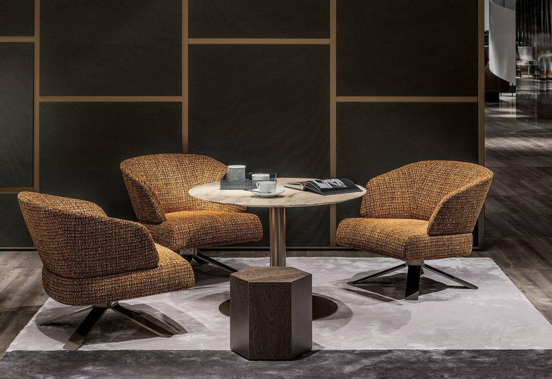 The Reeves “Small” armchair and the semi-round “Lounge” sofa are synonymous with compact size and the sophisticated constructive details that set the entire Reeves collection apart. The Reeves “Small” armchair comes with either a fixed or swivel base.