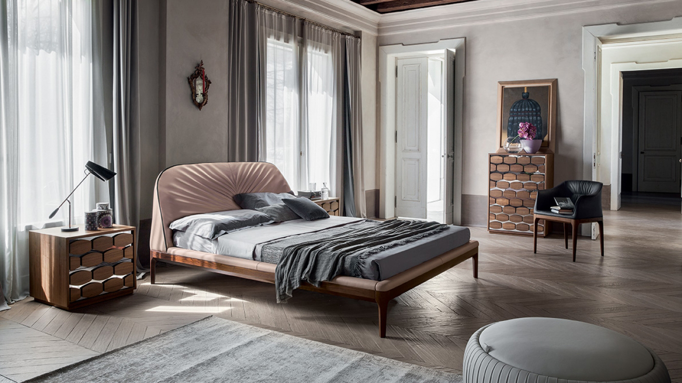 Michelangelo’s wooden structure is slim and essential, meant to exalt the headboard, which is a sartorial masterpiece: rounded, with an eco-leather, leather or grain leather upholstery, its hand-made pleating generates a wonderful fan-like effect. Thanks to all the kinds of leather and colors available, Michelangelo is an extremely customizable item.