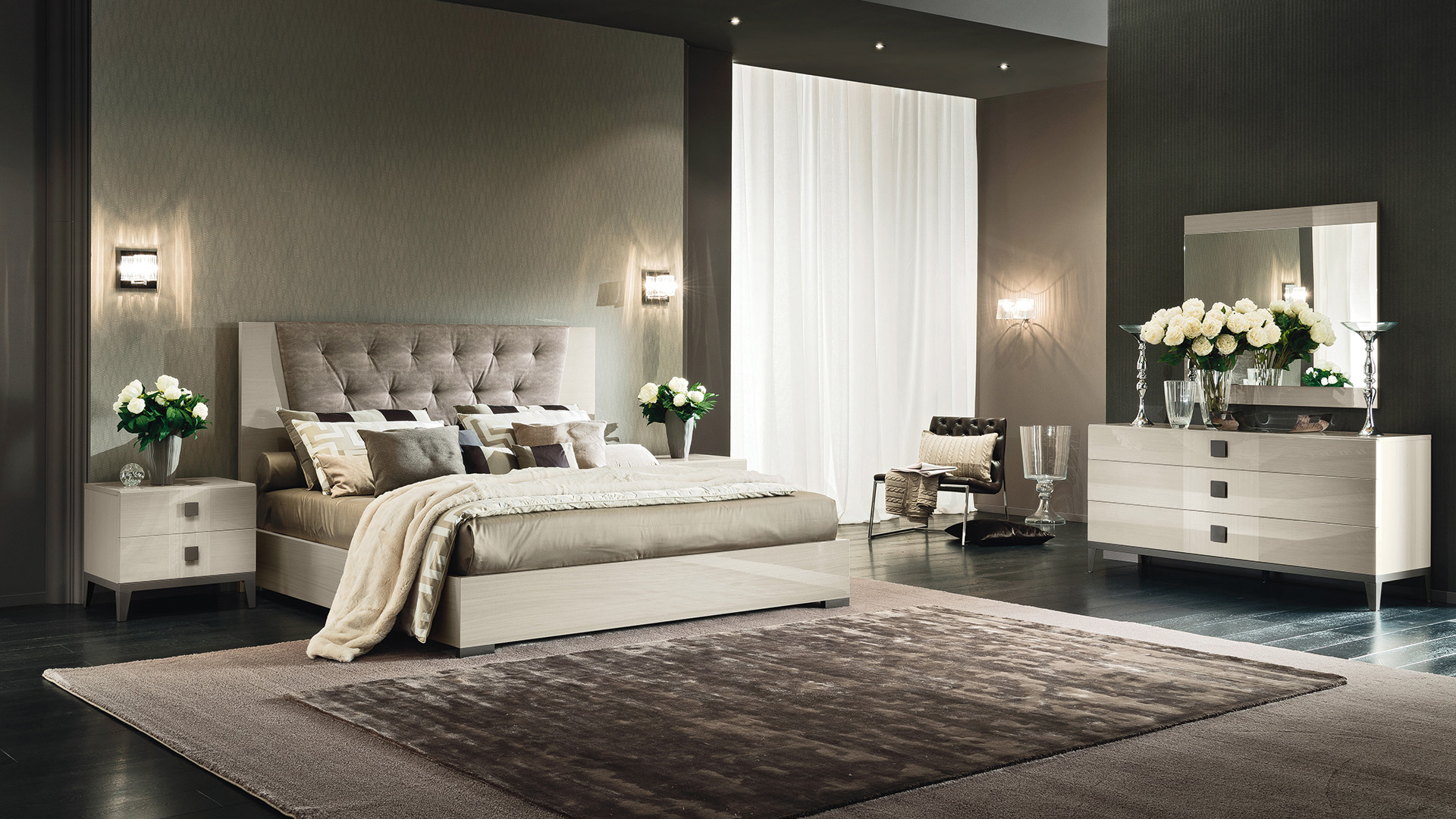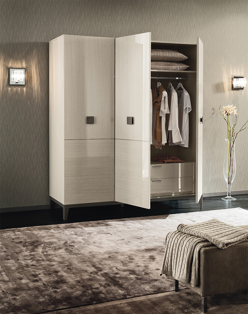 The Mont Blanc Bedroom Collection features a glossy Koto veneer finish. Its details consist of light wood veneer and metal elements in metallic gray. The Mont Blanc Bed`s headboard is versatile giving you to option of having it in wood or padded. the case goods consist of matching nightstands, dresser, mirror, chest, and wardrobes. The wardrobes come with 2 or three swinging doors making it the ultimate space saver.