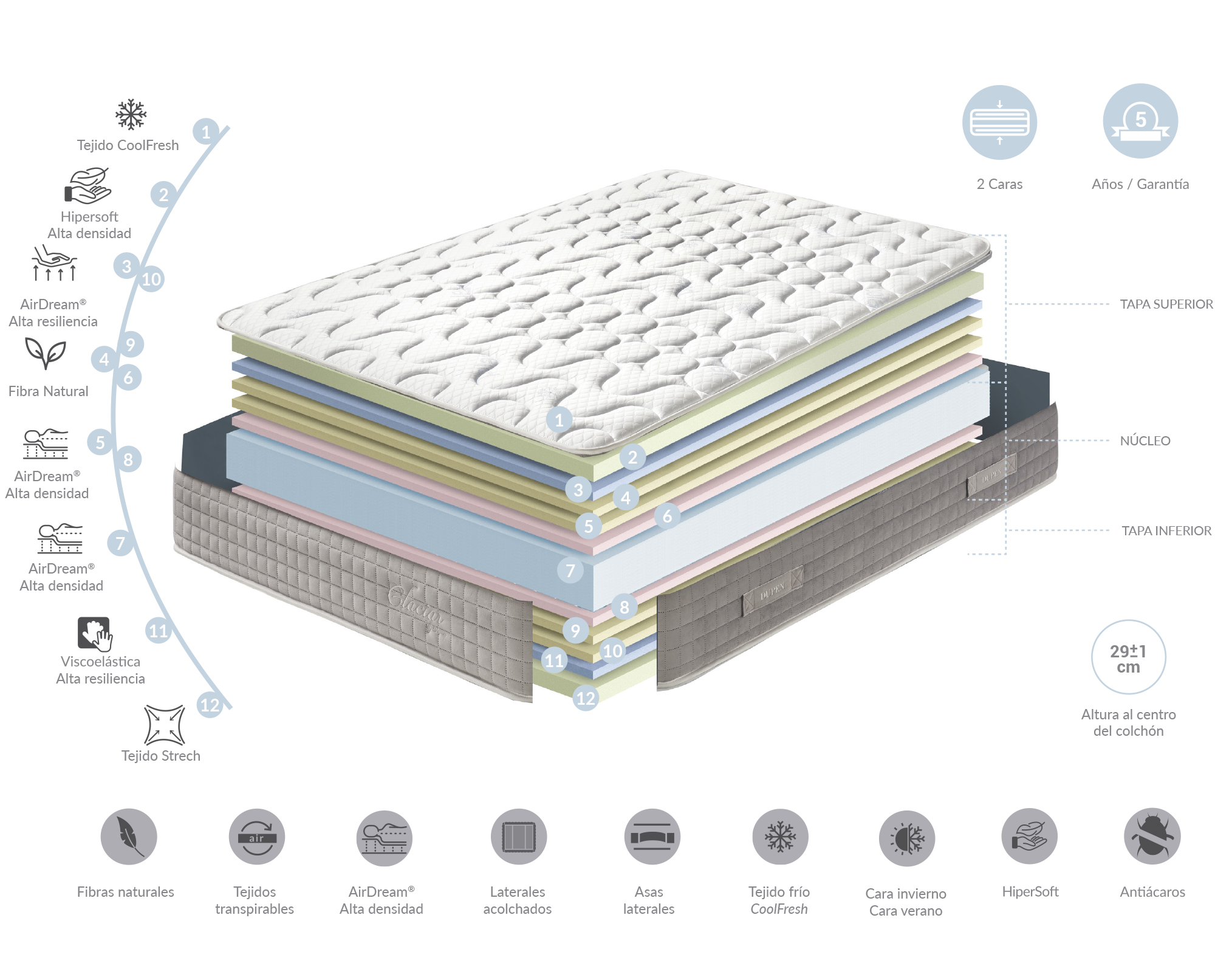 The Glaciar mattress is a new technology mattress, specially comfortable to use during the summer months thanks to the cooling effect fabric that helps to regulate the body temperature. The summer side with the Glaciar fabric Coolfresh will dissipate 45% of the heat and humidity which guarantees a comfortable sleep during those hot summer months. The winter side of the mattress is made of high density memory foam that distributes body temperature evenly, creating a warmer and comfortable feeling and greater sense of comfort during the cold months.