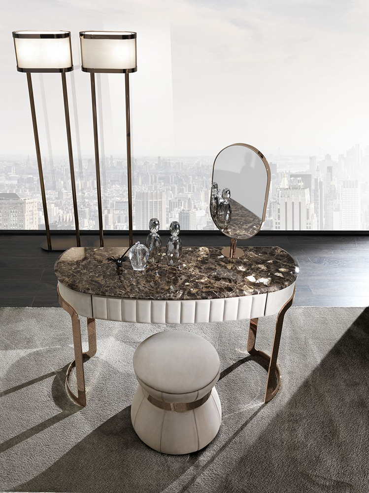 Dressing table Coco will be the decoration of the ladies bedroom. It has a beautiful oval marble top and a functional drawer for small items. The front of the drawer is trimmed with leather with an original screed. A large oval mirror is fixed on the table top. The table is supported by two figured pillars made of sparkling brass.