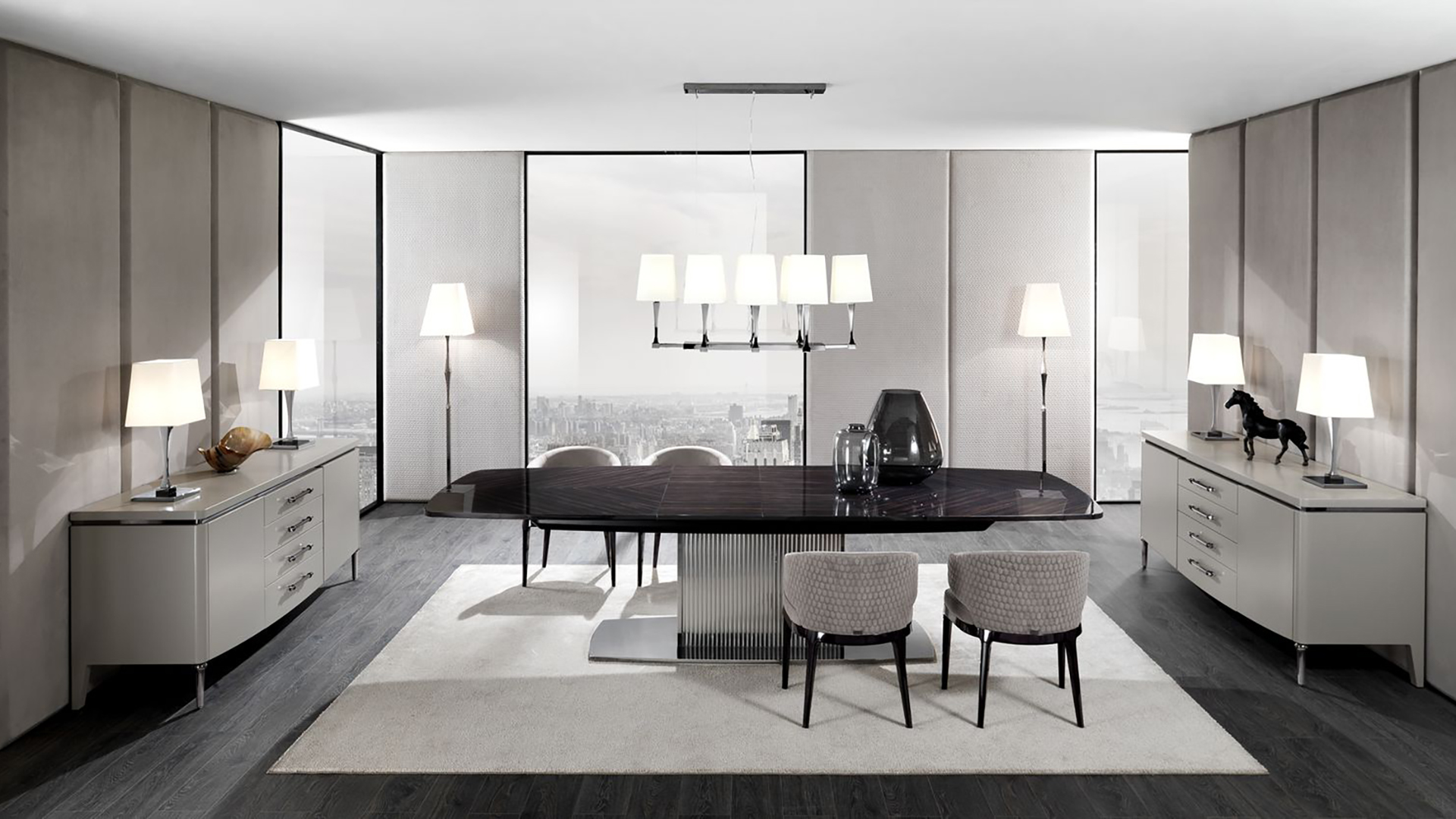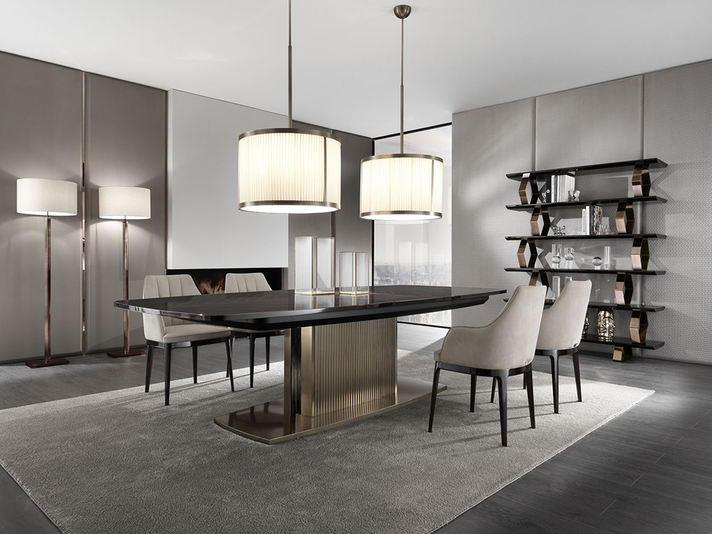 Extendable table on stainless steel base with rectangular top. There are different options for finishing the base and countertops.