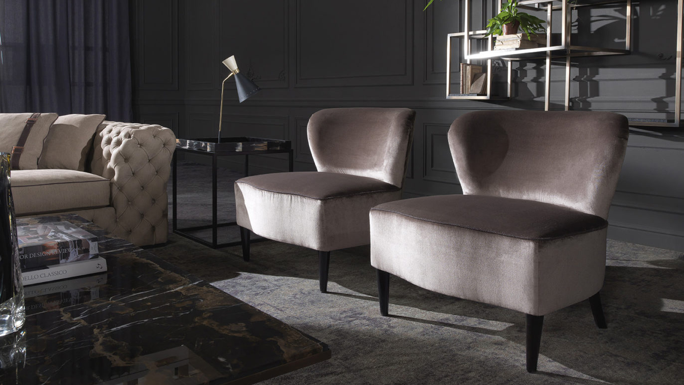 The sensuality of velvet becomes ultra-chic in Melrose armchair. The refined shimmering grey colour adds value to the simple shapes of the armchair, supported by wood feet in a special black finishing with mahogany shades, typical element of the Gianfranco Ferré’s style.