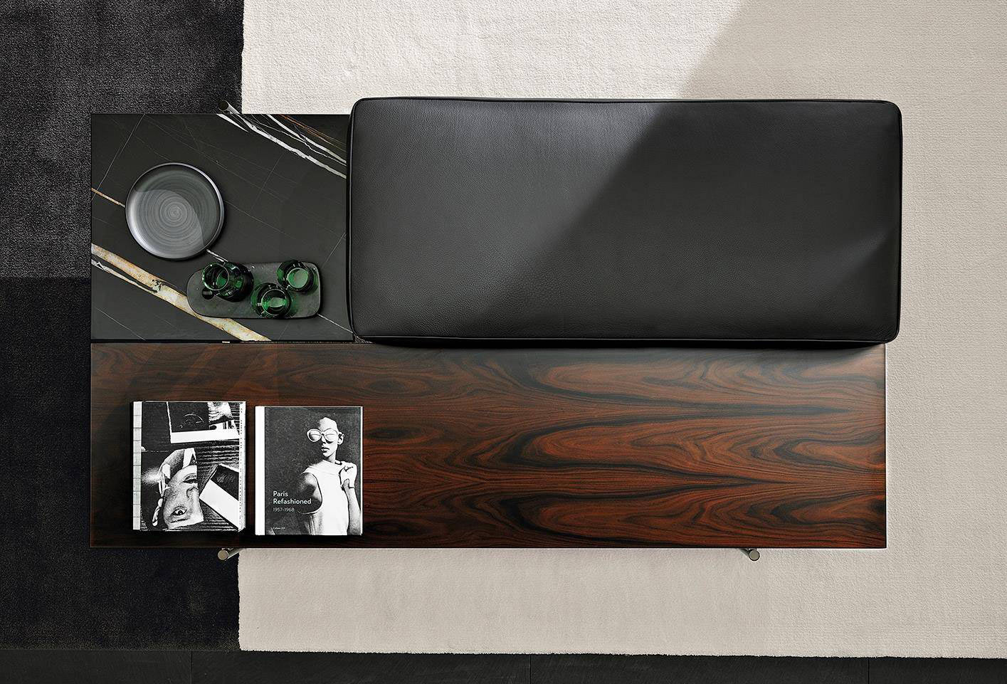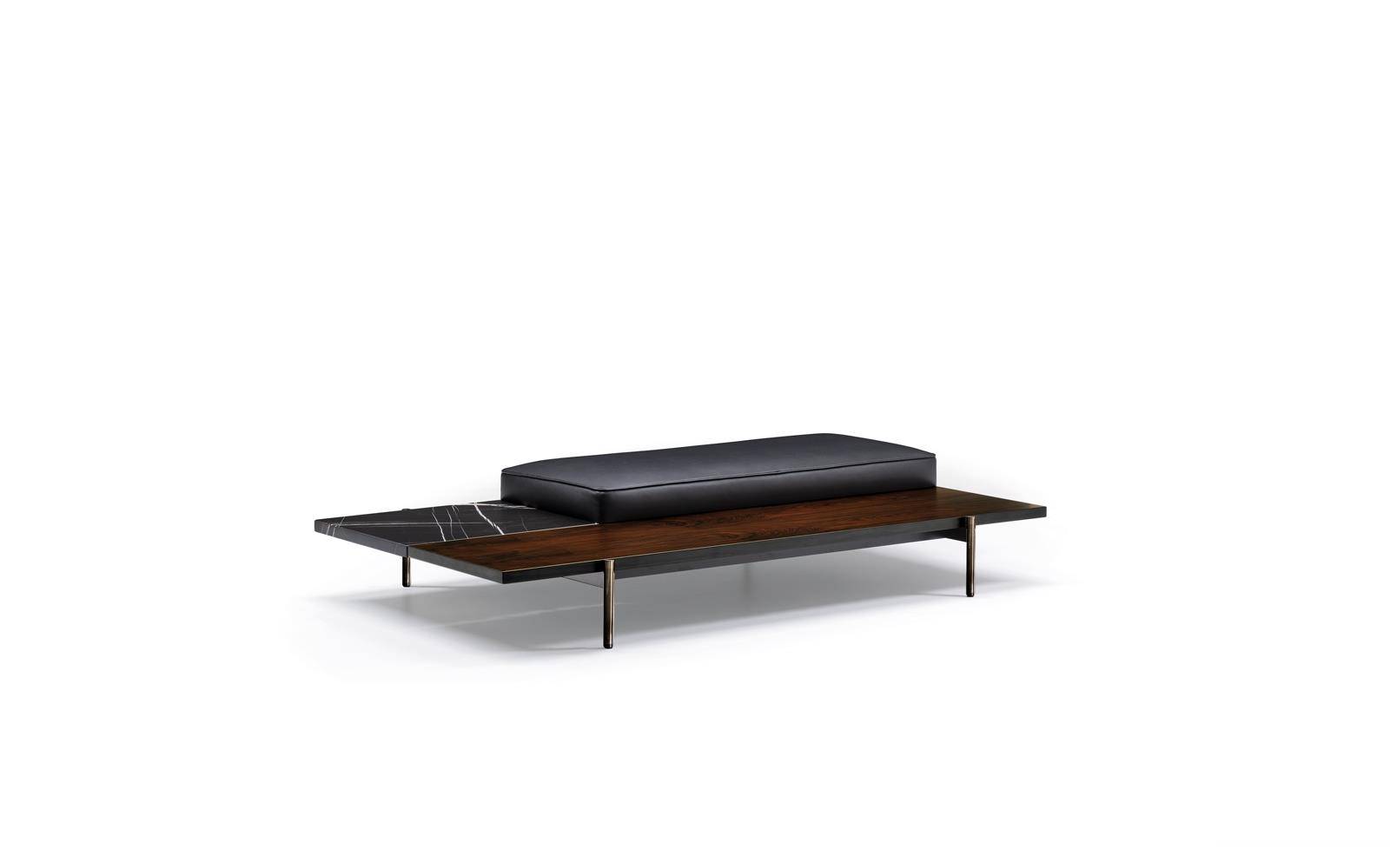 The benches, characterized by different densities of cushioning, are available in two heights (cm 34 and cm 42) and come in four versions: with all-fabric or leather covering (cm 126x128), with seat paired with a top in Dark Brown stained palisander Santos (cm 126x128), with seat set beside a top in Calacatta or Sahara Noir marble (cm 182x58) or with two tops, in solid wood and Calacatta marble or in wood and Sahara Noir marble (cm 182x102).