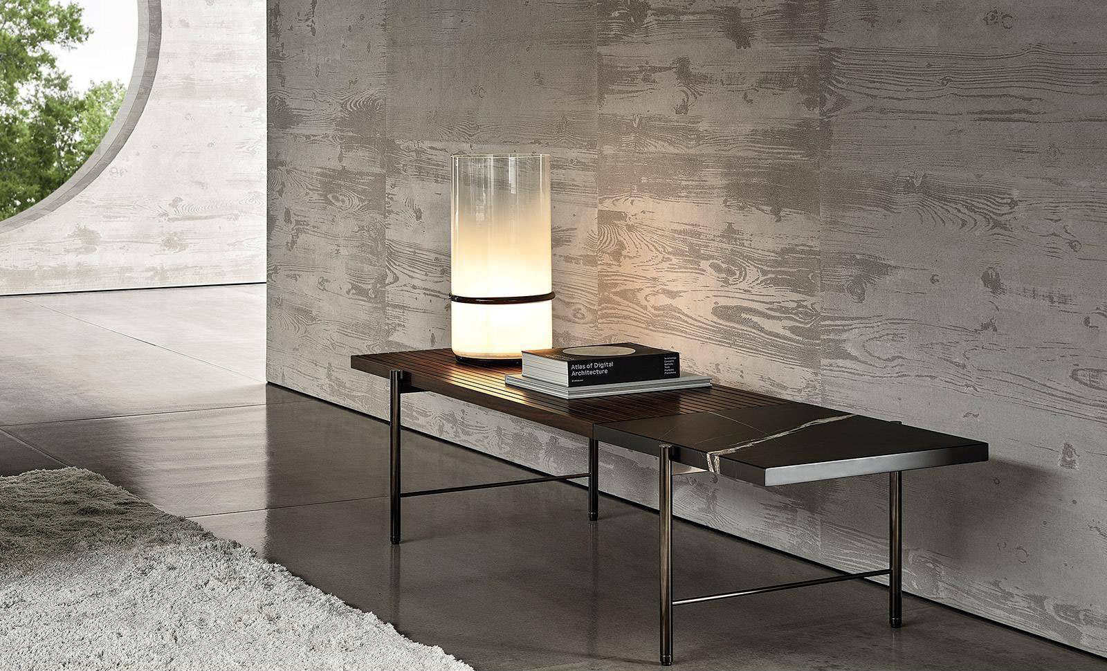The architectural imprint that characterises the airy volumes of the Superquadra storage units, translates into the graphic minimalism of the Superquadra line of coffee tables, benches and console tables.