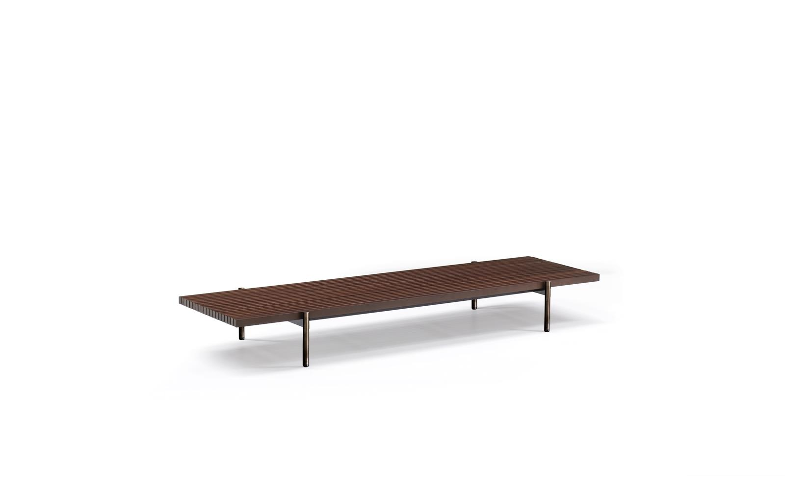 The elements rest on a base with protruding legs, in aluminium with a polished Brandy varnished finish, giving the products an ultra-lightweight look.