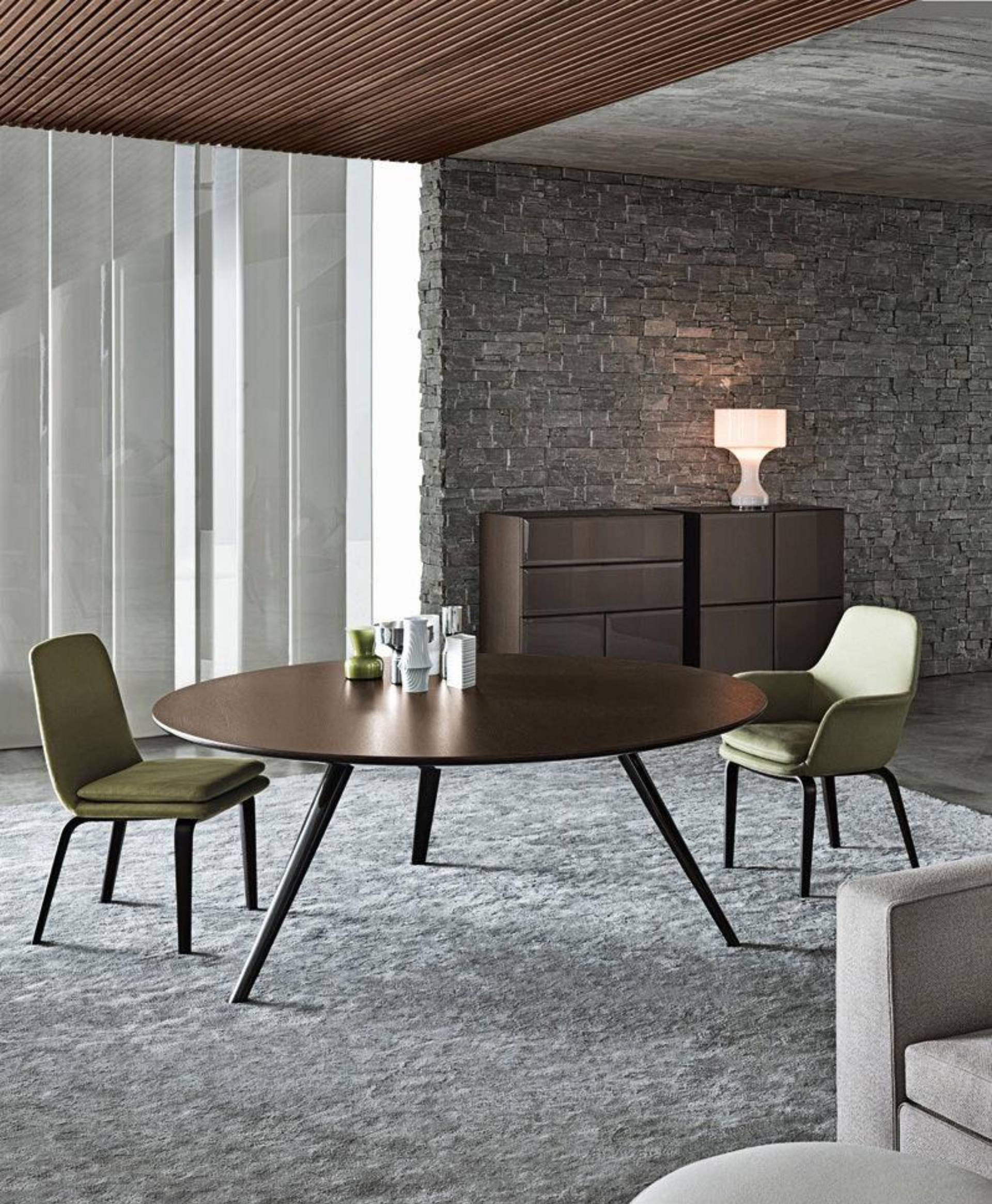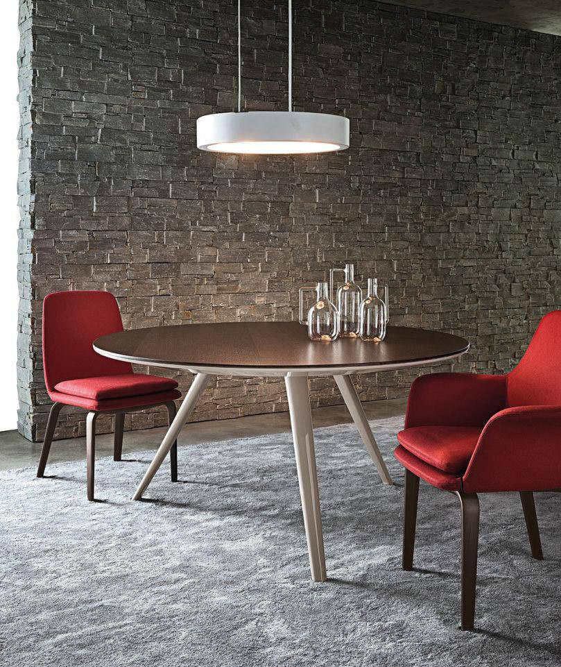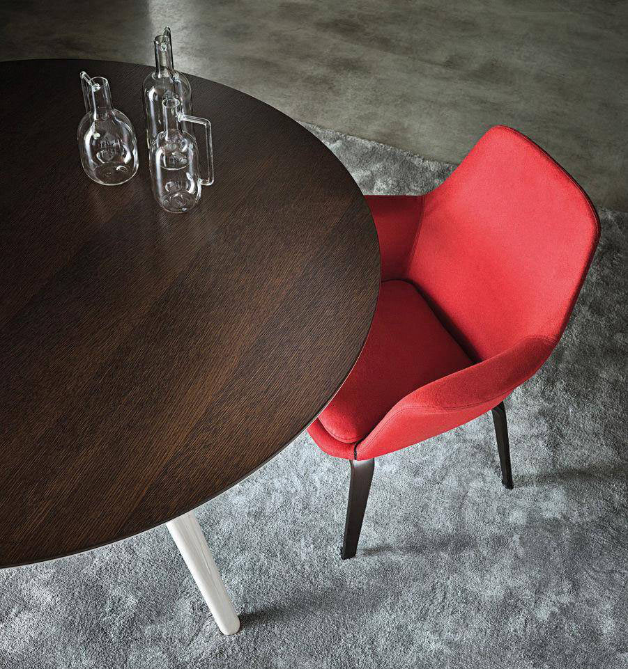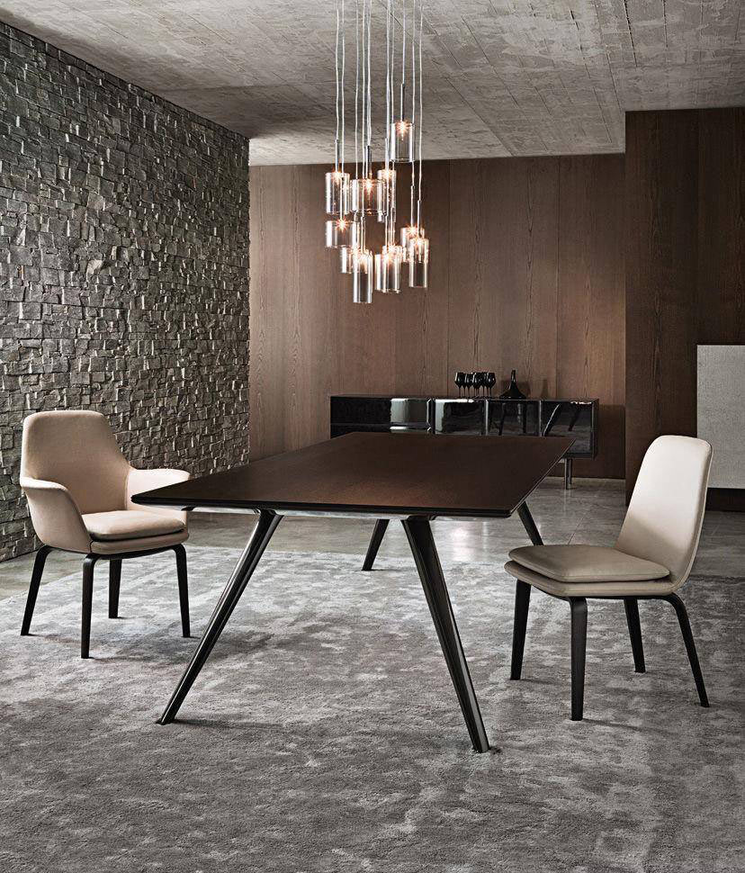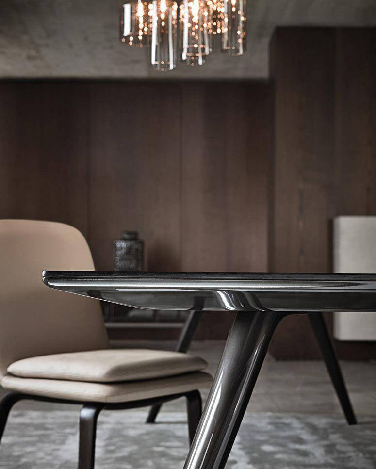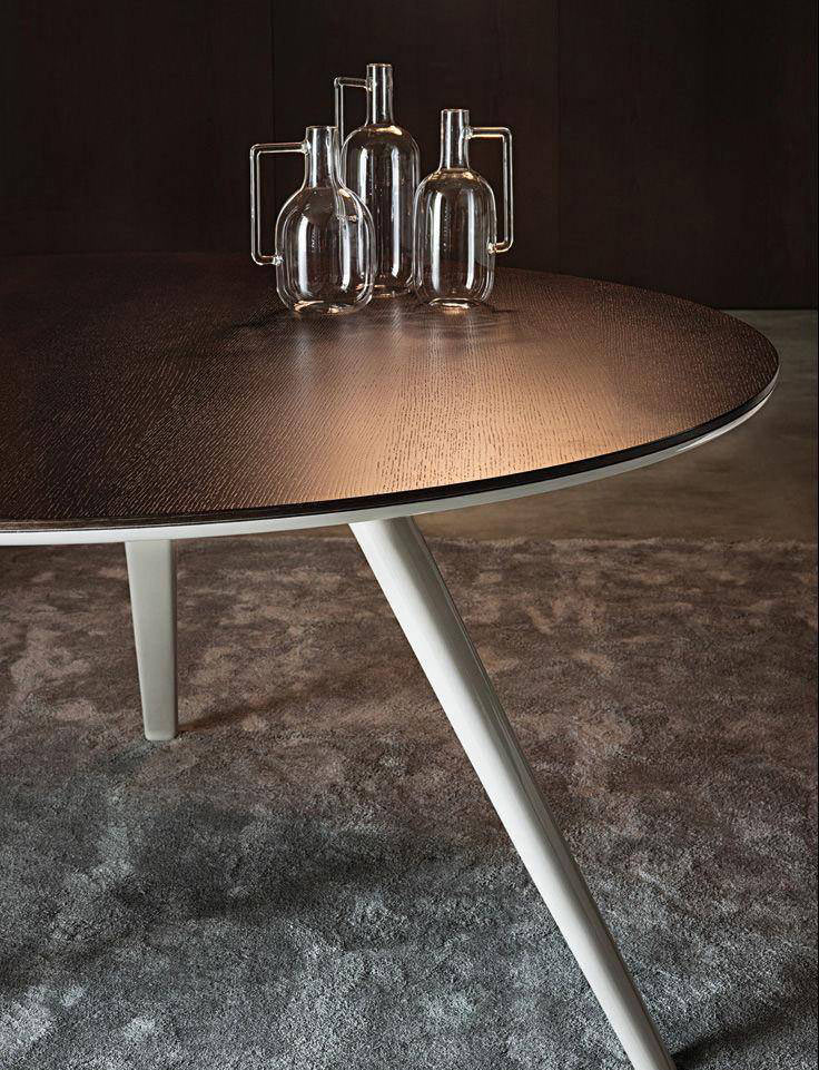 Every detail in the Evans table encapsulates the complexity that hides behind a seemingly apparent simplicity. The legs – three for the round table version and four for the rectangular one – are in die-cast aluminum and have a tapered line that makes its separation from the ground particularly dynamic giving a sense of great lightness to the table.