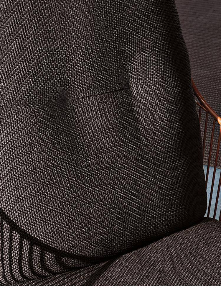 The enveloping shape of the metal backrest accommodates a soft cushion that makes the Colette “Outdoor” armchair even more comfortable. The profile of the metal structure is calendered, assembled and welded in more than 300 places. The metal structure is first sandblasted to remove any imperfections and then epoxy powder-coated to ensure optimal resistance to corrosion and weather. The structure of the seat ends at the front in a support structure wrapped in cord made from a special braided polypropylene fiber, available in four colors: Sand, Sunflower, Khaki Green and Rust. The epoxy paint for the metal structure comes in the same shades as the cord Clay, Sunflower, Khaki Green and Rust.