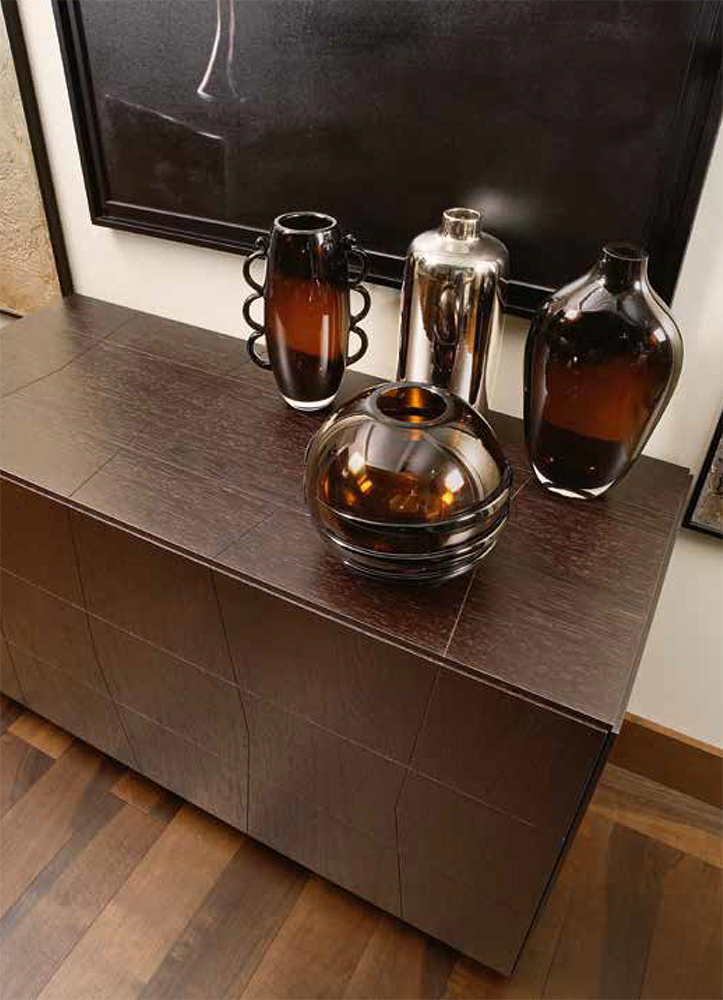 Wooden dresser, 3 drawers, polished stainless steel details.