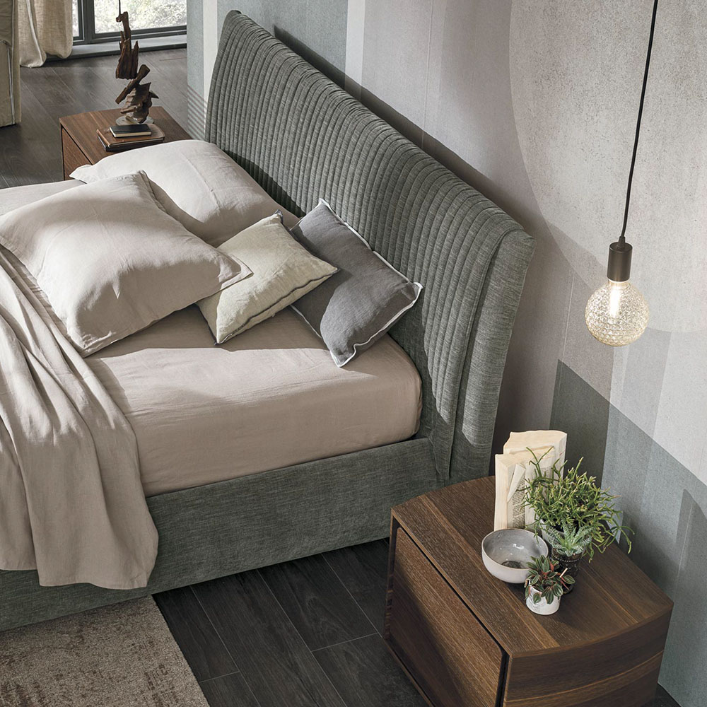 An upholstered headboard decorated with original, decorative, vertical stichtings: this bed combines the unusual ribbing on the headboard with a carefully-crafted bed frame. Style and materials are both in perfect harmony.
