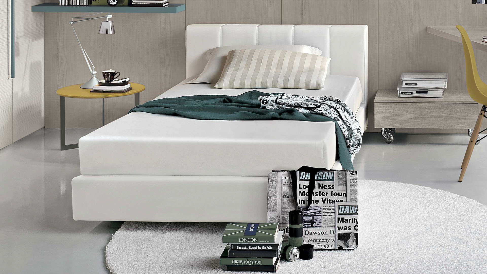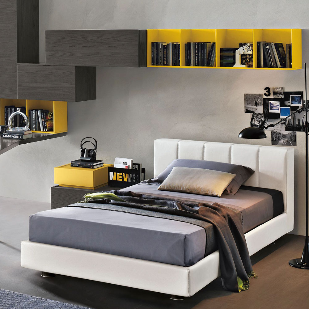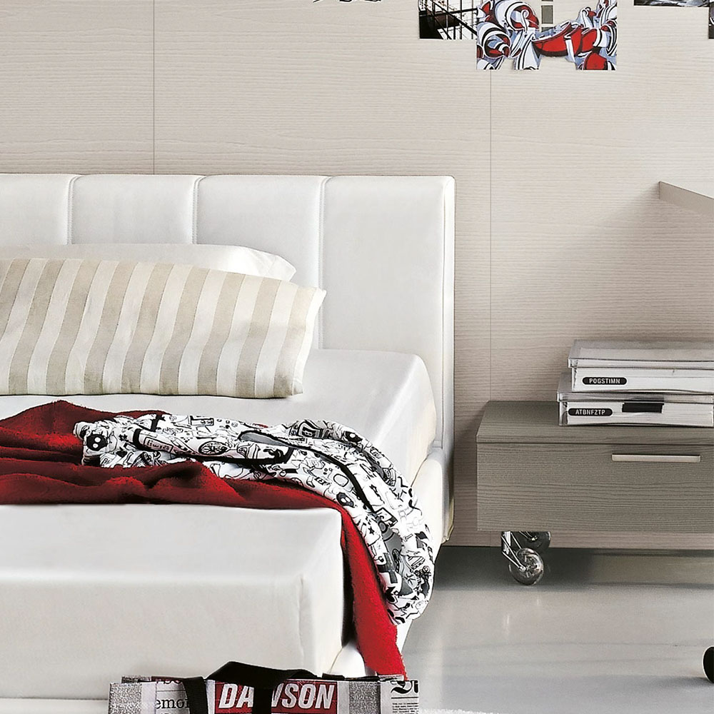 Padded bed available in various sizes, with a storage unit. Bed with finished back.