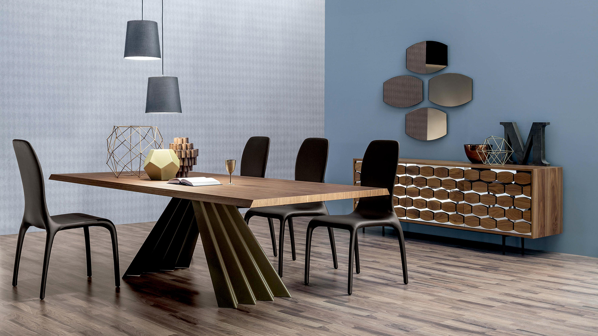 Solid wood provides further endurance and beauty: a whole board, warm and resistant, elegant and classic, standing out, above the contemporary base.