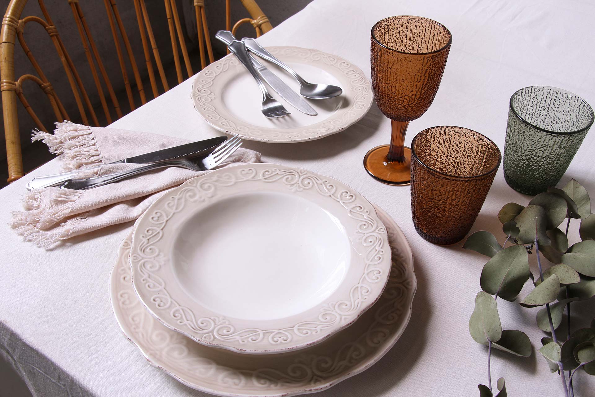 The tableware from the Cozy line in white and beige is adorned with delicate handmade reliefs, making it ideal for decorating your morning table.