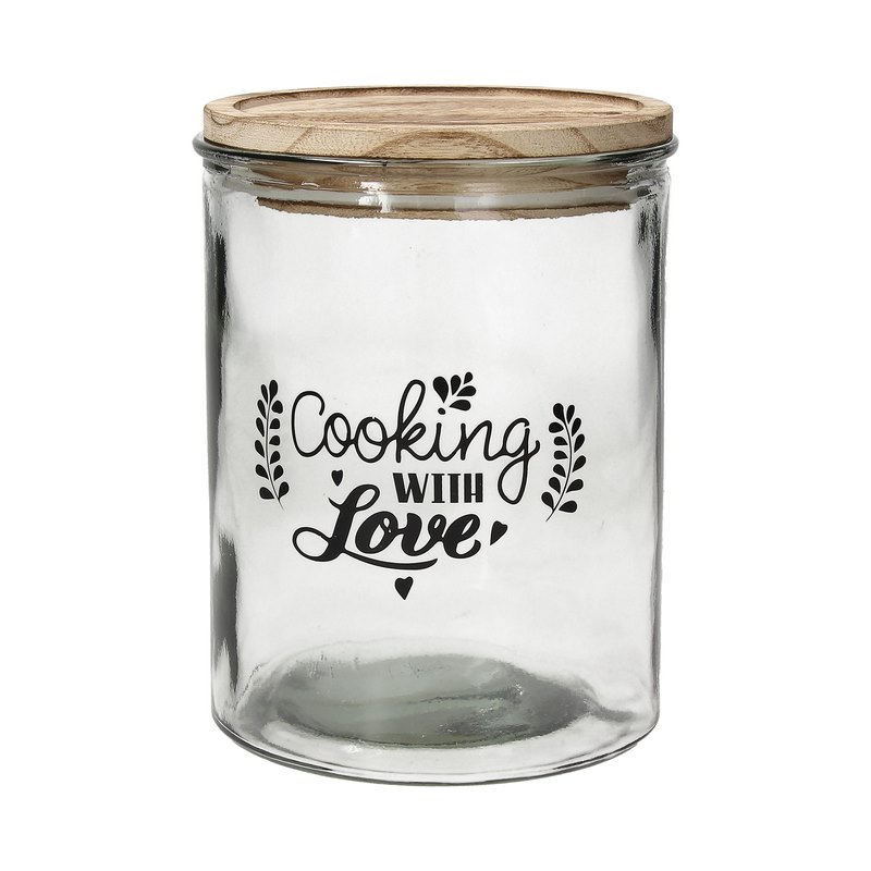 The jar of the Cooking With Love line is part of a range of practical table accessories. This clear glass jar with black decor and light wood lid is perfect for everyday use as a food container and adds an urban touch to your kitchen.