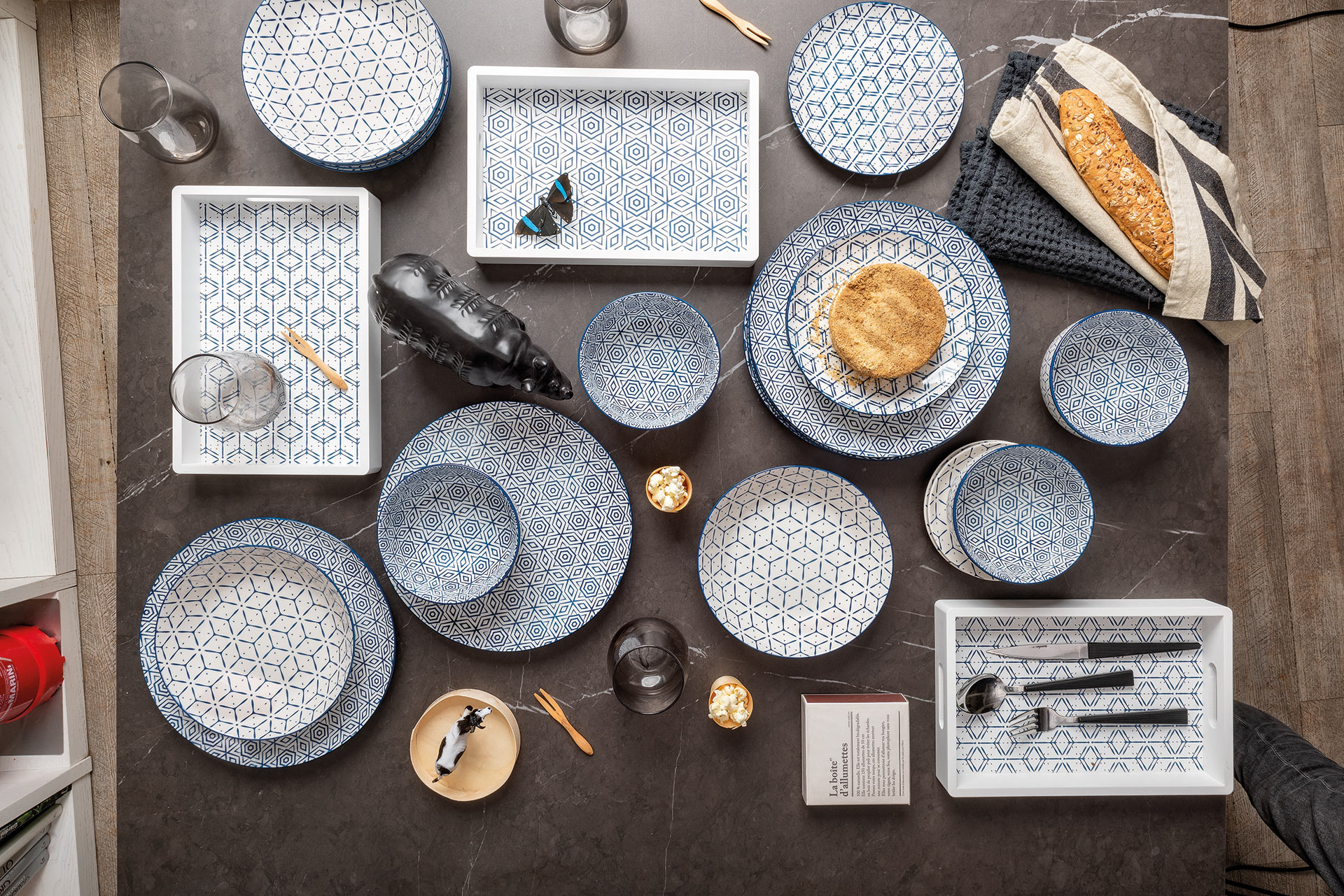 The Down Town line mug is crafted from fine porcelain and finished with an original blue geometric motif, making it perfect for recreating a modern metropolitan feel on your table. It can be used as a daily breakfast or snack, or combined with other accessories and serving items from the same line.