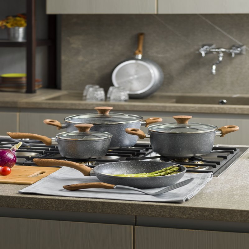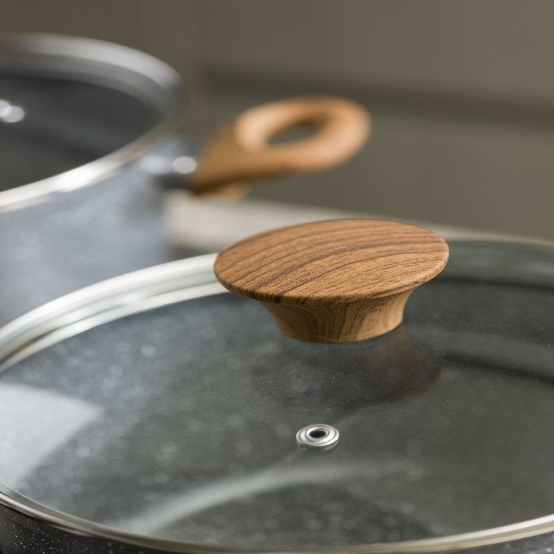 A unique natural style made to last, the Stone&Wood series features a forged aluminum body and extra thick bottom that is also suitable for induction hobs. PFOA-free, nickel-free, water-based coating allows you to prepare healthy food. Non-slip and heat-resistant soft-touch, wood-effect handles pair perfectly with stone-style cookware.