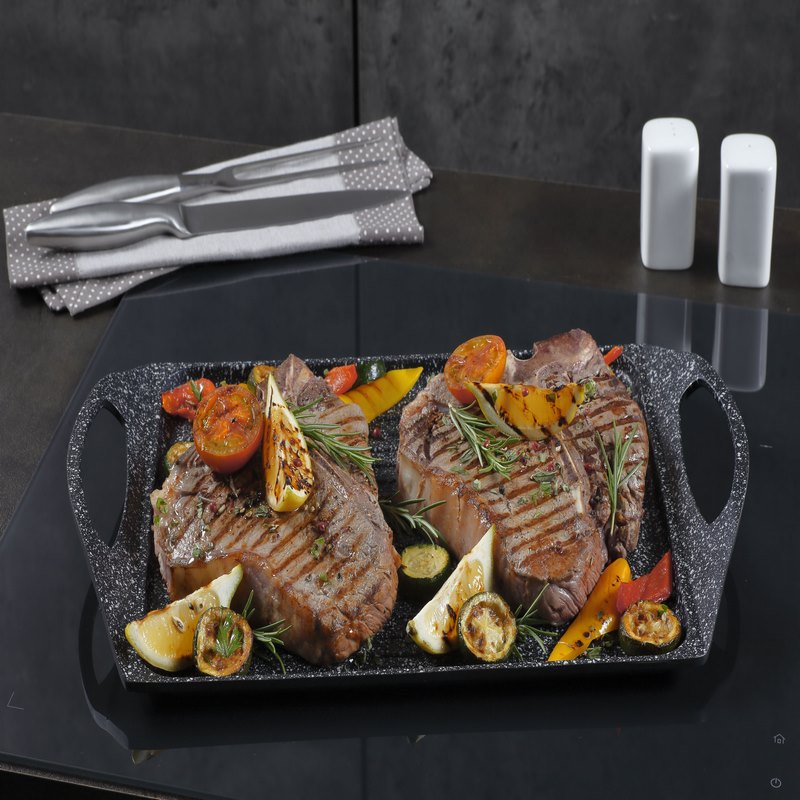 The Sphera Rectangular Double Sided Pan is therefore suitable for all cooking surfaces and also allows healthy and healthy cooking as it is nickel and PFOA free. The Soft Touch bakelite handle has an elegant, refined and patented design.
