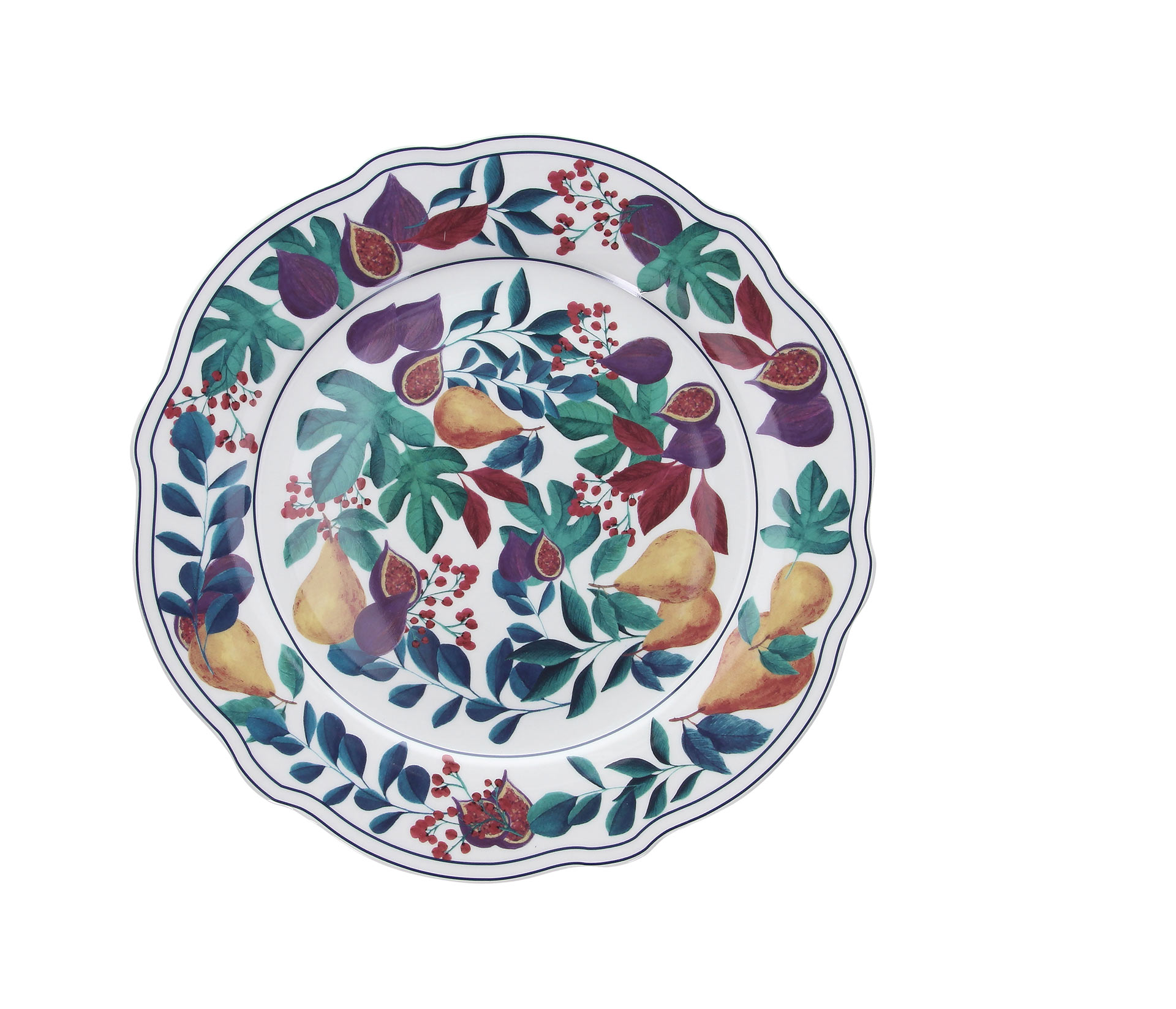 In fact, seasonal fruit and dark shades of blue and purple adorn this round serving dish, and it can also be paired with dinnerware from the same line for a complete set.