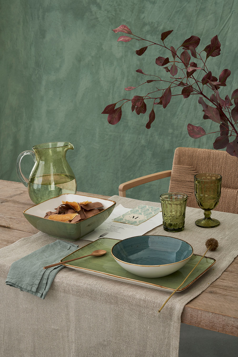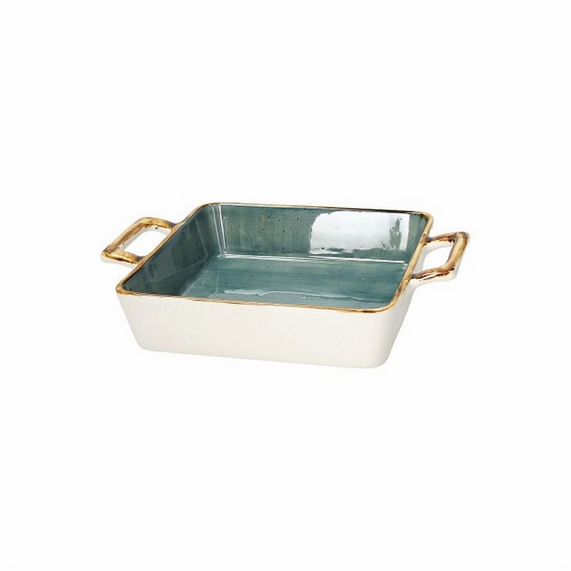 From the golden finish of the handles and edges to the emerald green color that covers the entire interior, the rectangular baking dish adds an exotic touch to your table and is ideal for serving and baking entrees, side dishes or main courses.
