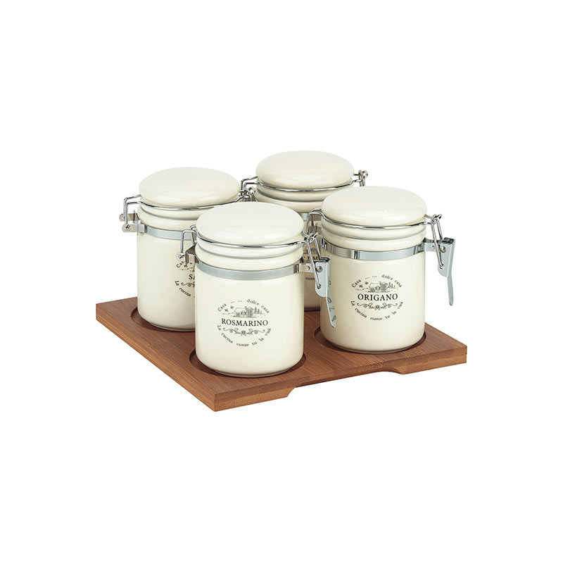 Set of 4 spice jars (oregano, rosemary, sage and thyme) in porcelain with wooden base and metal clasp.