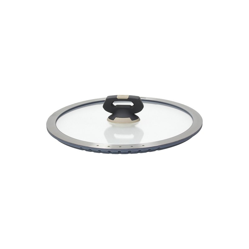 The Italika Premium Line lid has a clear glass body and a steel rim with drainage holes. Thanks to the transparent glass, the lid guarantees the visibility of cooking. It features a non-slip, anti-scald silicone handle for a comfortable and secure grip.