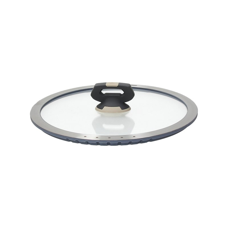 The Italika Premium Line lid has a clear glass body and a steel rim with drainage holes. Thanks to the transparent glass, the lid guarantees the visibility of cooking. It features a non-slip, anti-scald silicone handle for a comfortable and secure grip.