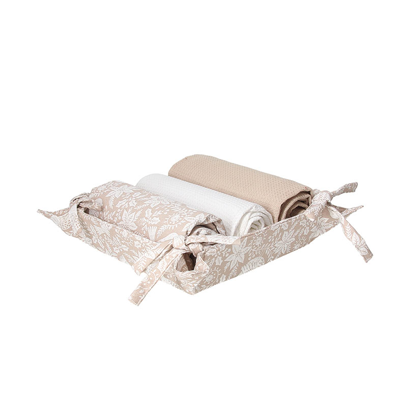 The square bread basket set with 3 kitchen towels is part of an elegant collection of cotton and lace textiles in beige tones. 3 kitchen towels can be used both as kitchen towels and as a guest toilet set. Prints and embroidered white lace make it delicate and sophisticated, perfect for Christmas.