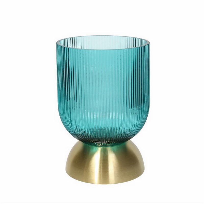 Featuring a gold base, the turquoise Honey vase is crafted from stained glass and adorned with 70s striped motifs that give it vintage style and timeless retro flavor. As such, it also lends itself perfectly to a contemporary context, aiming to complement designer pieces with the iconic style of the past.