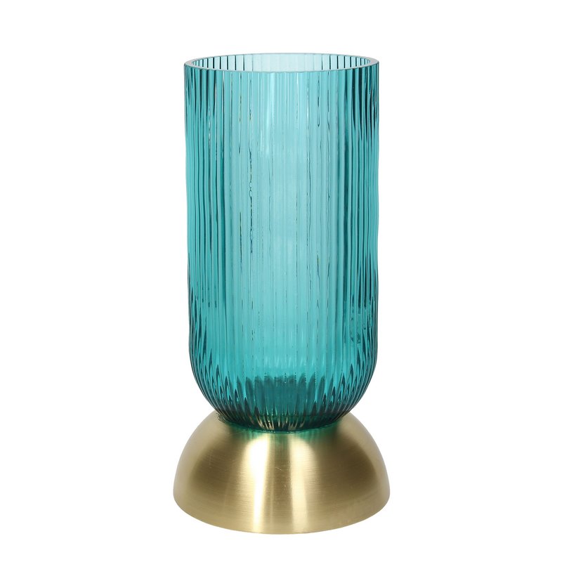Featuring a gold base, the turquoise Honey vase is crafted from stained glass and adorned with 70s striped motifs that give it vintage style and timeless retro flavor. As such, it also lends itself perfectly to a contemporary context, aiming to complement designer pieces with the iconic style of the past.