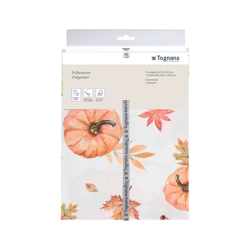 This water-repellent tablecloth is perfect for a table for 6 people. The white base is adorned with leaves and pumpkins in shades of yellow and orange.