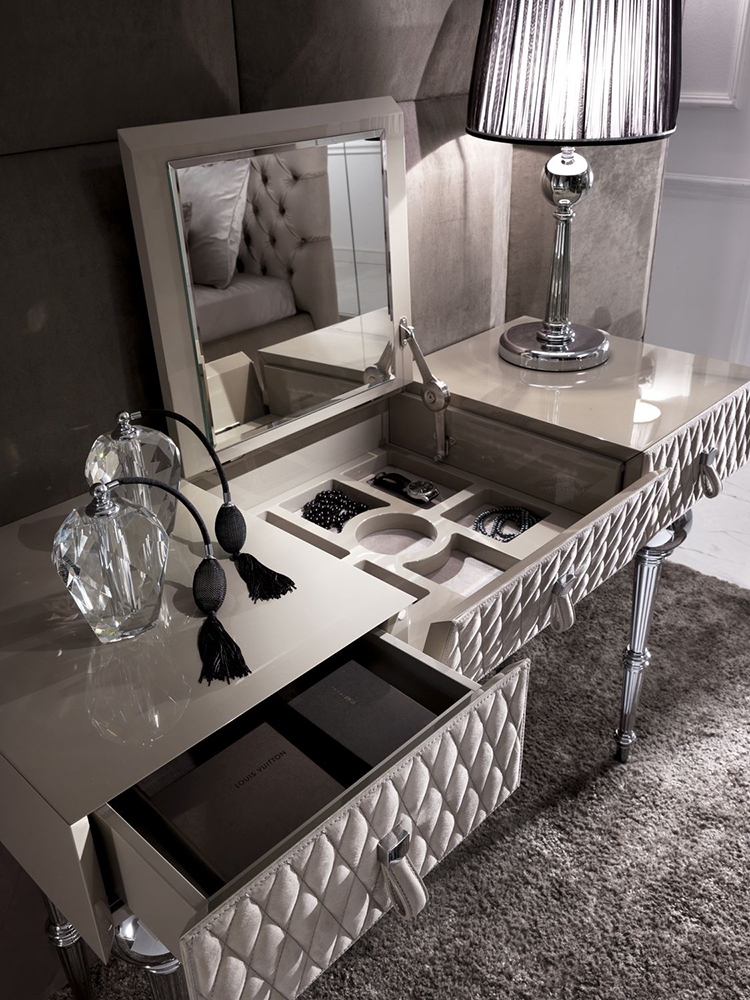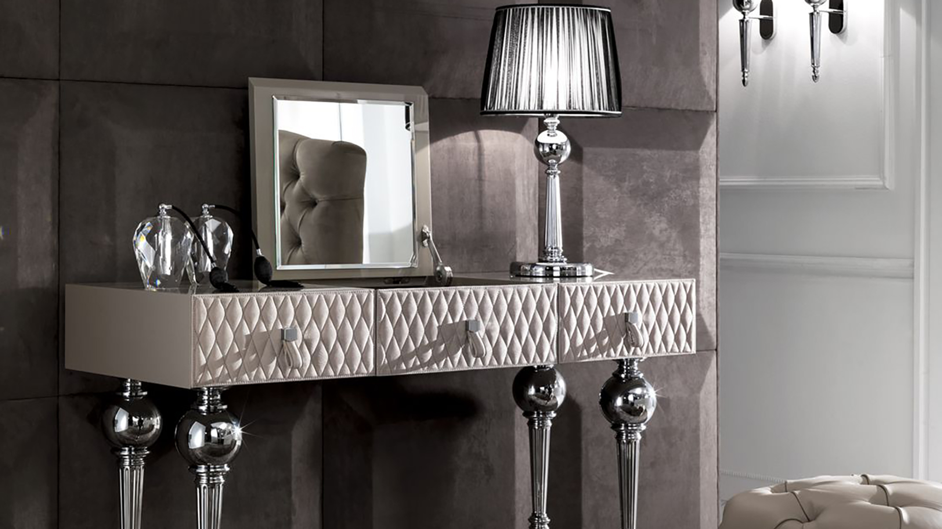 Dressing table with a rectangular mirror Egoist Prince is a universal solution for arranging apartments in a modern style. The table is complemented by three drawers, the surface of which is covered with leather with a textured, quilted surface. The middle compartment folds up like a lid, giving access to a mirror and various women`s little things. Metal legs with glossy silver finish in vintage design, complete the look of the furniture and make it luxurious.