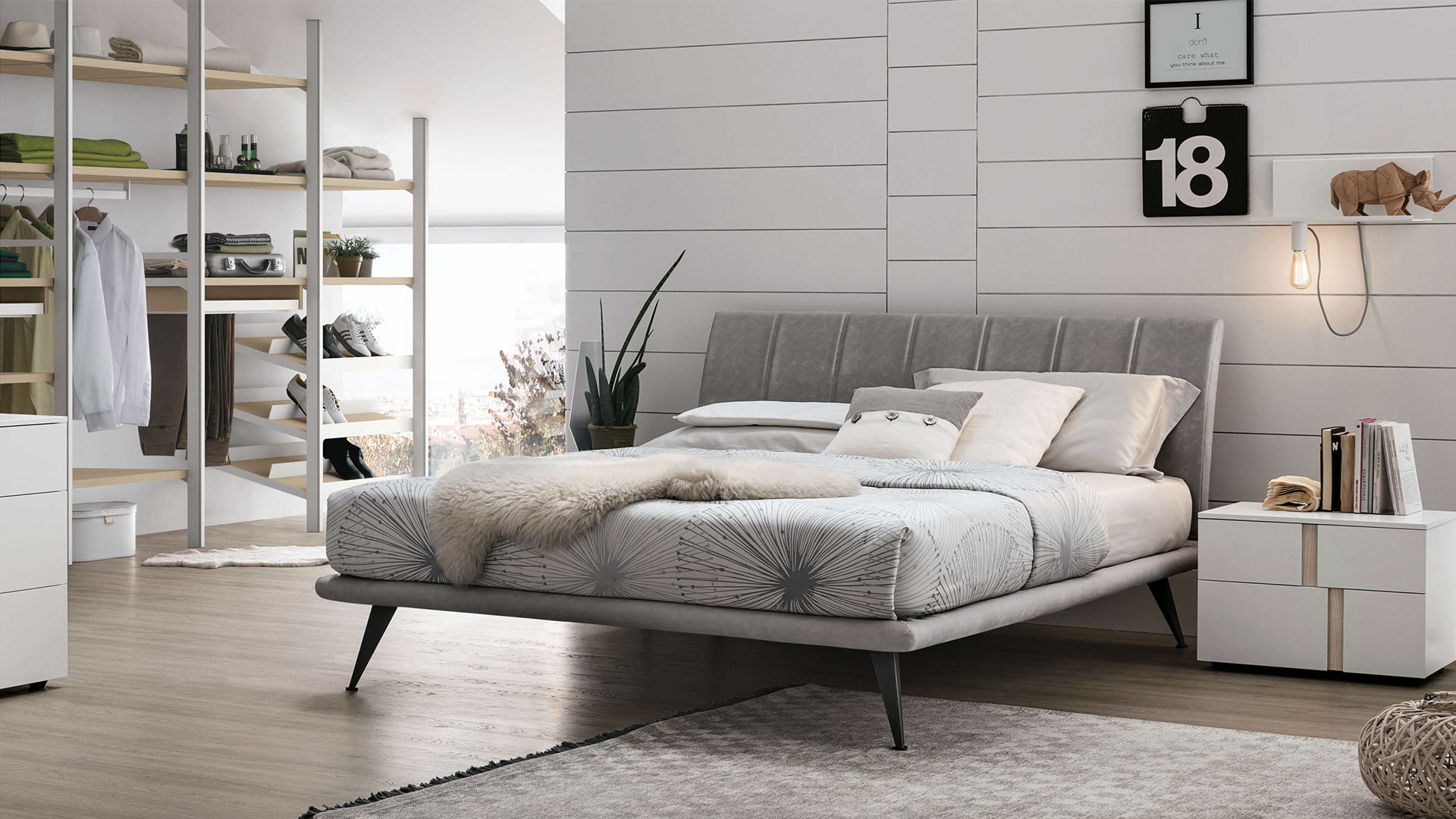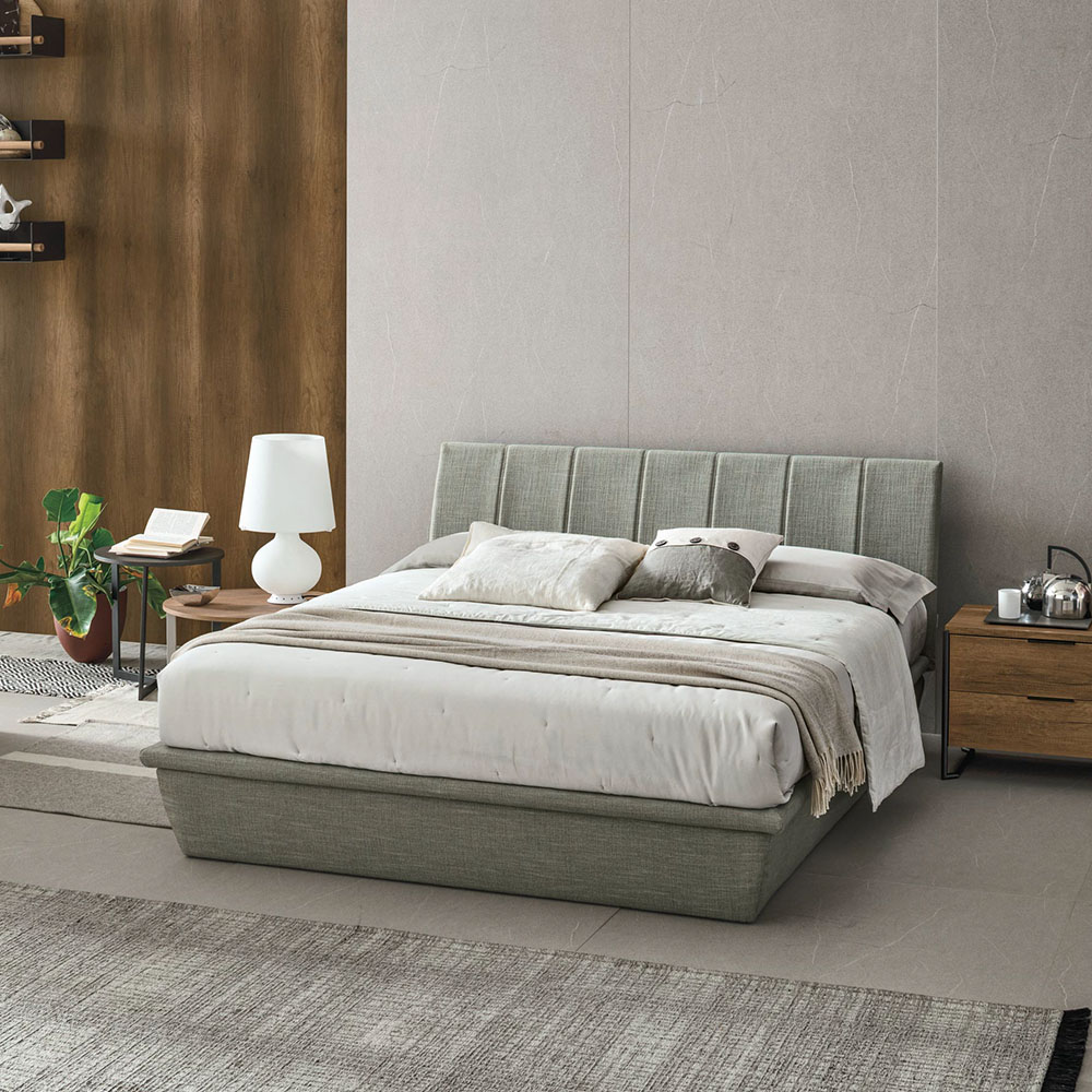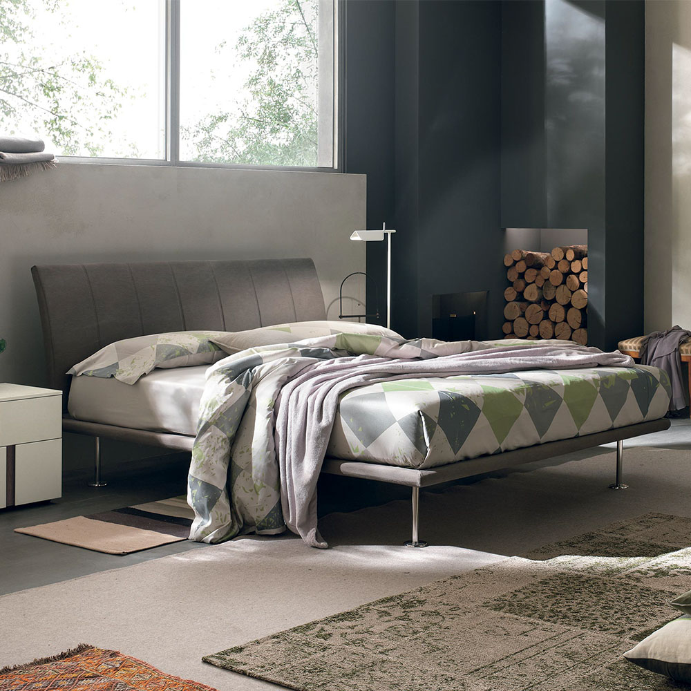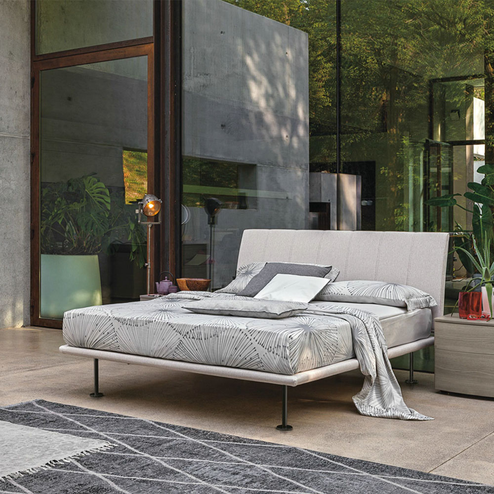 The vertical seams divide the headboard into seven parts that visually beat out its rhythm. Regular, with just one dynamic accent in the slight curve, the bed is minimalist and linear. For those looking for quality details.