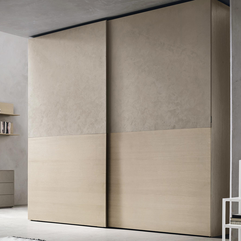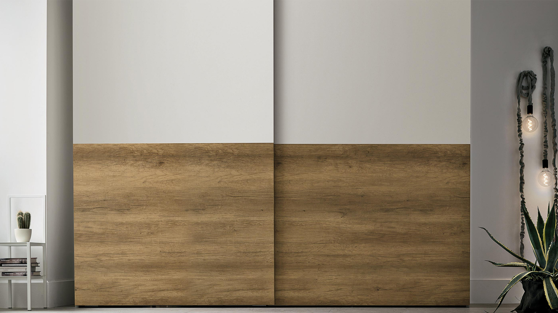 Two sliding doors with a light knotted textured and textured matt chalk white finish. Textured matt chalk white carcass.