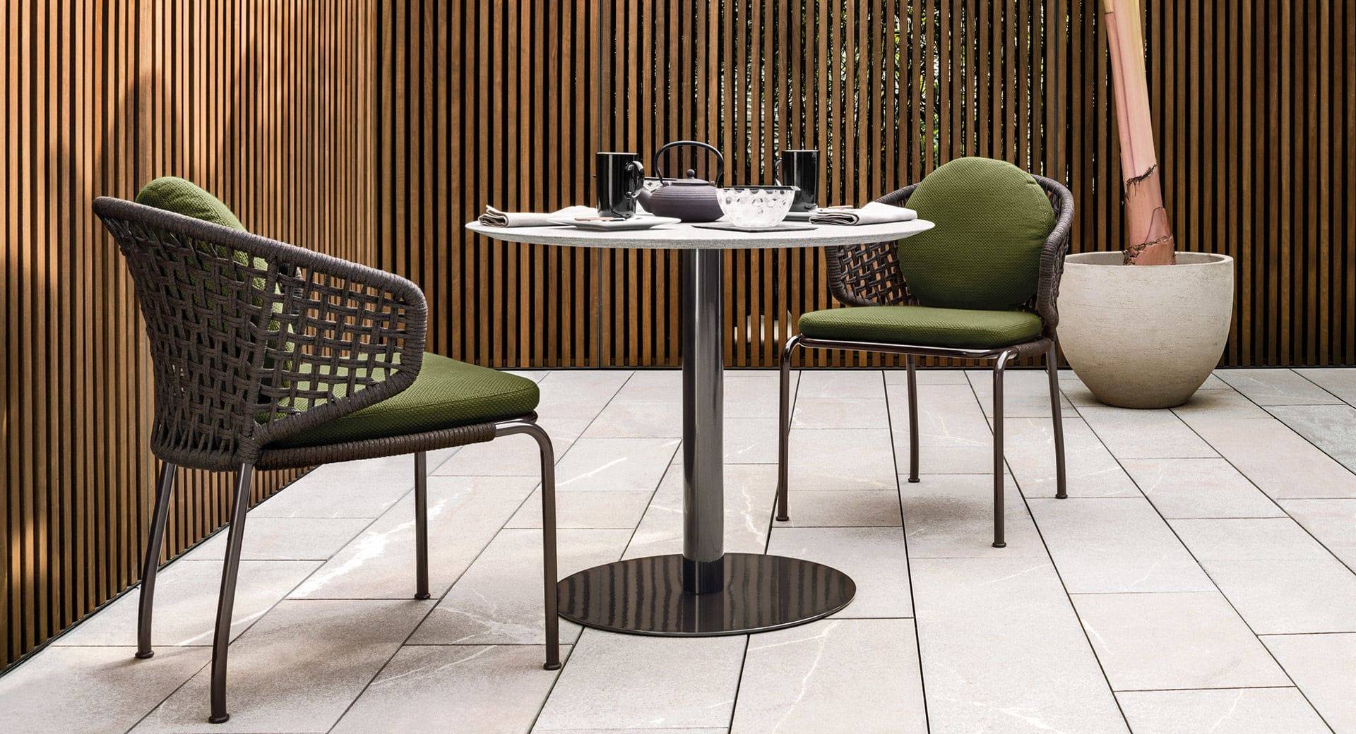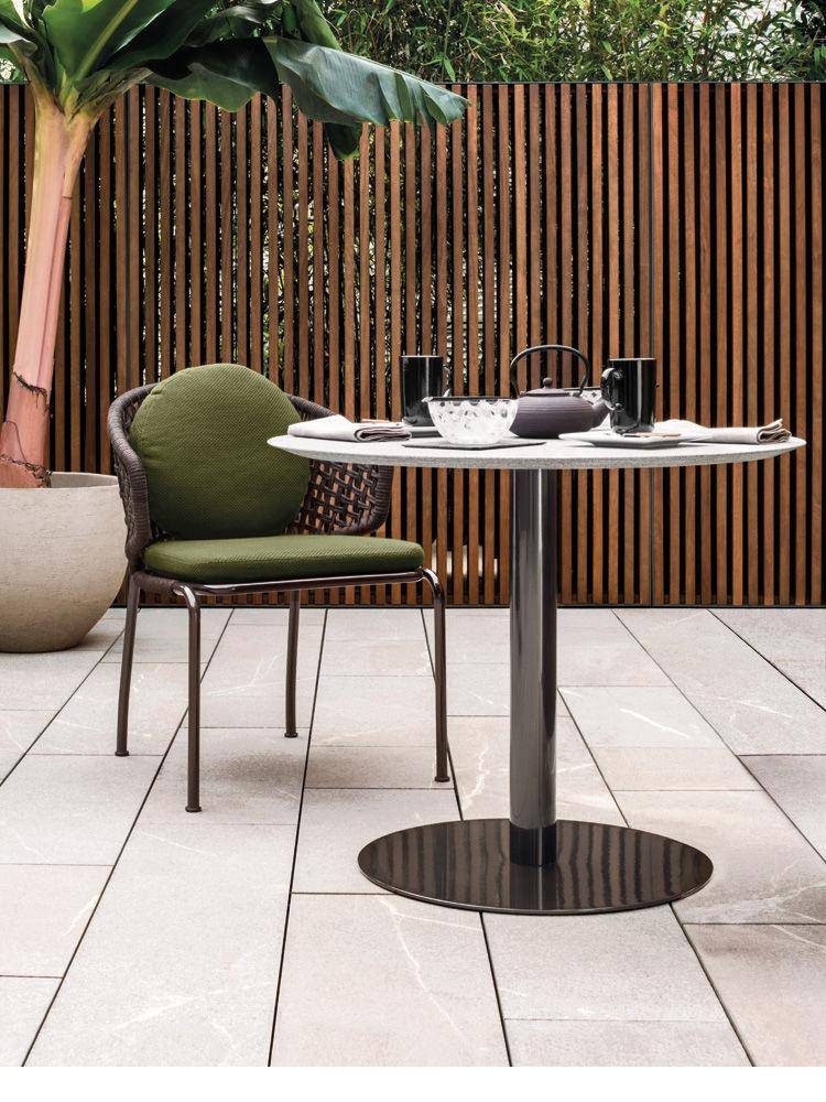 The Bellagio Outdoor tables are offered in a new version with beveled top in Silver Beola and base finished with an exterior Pewter color epoxy coating.