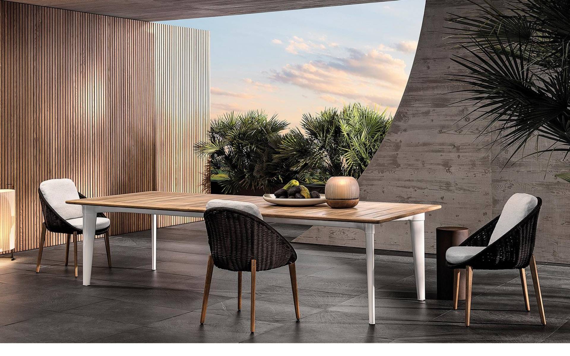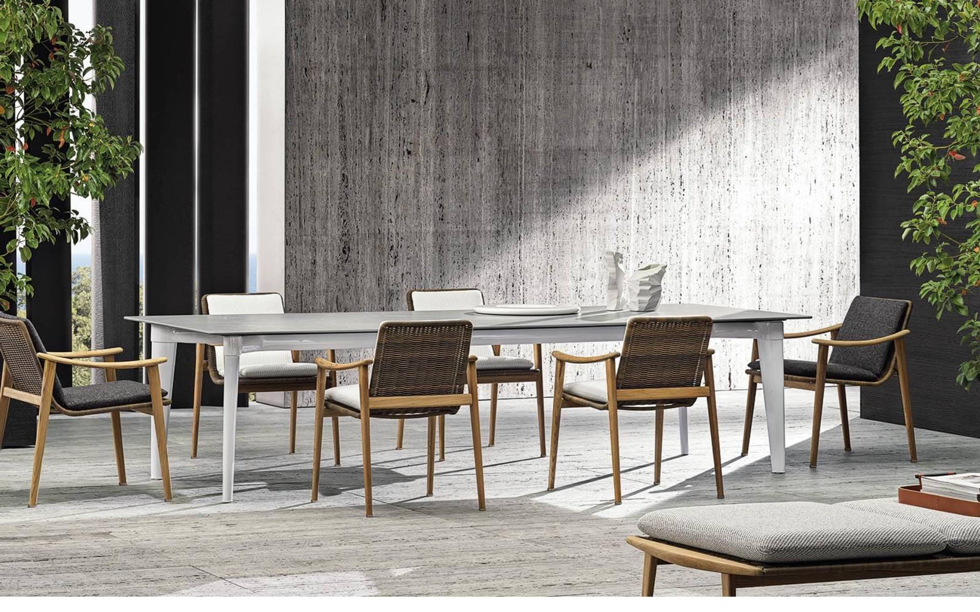 A table that expresses all the force of an architectural element, available in four sizes, three rectangular and one round, making it suitable for use in different spaces, from city verandas to larger garden settings.