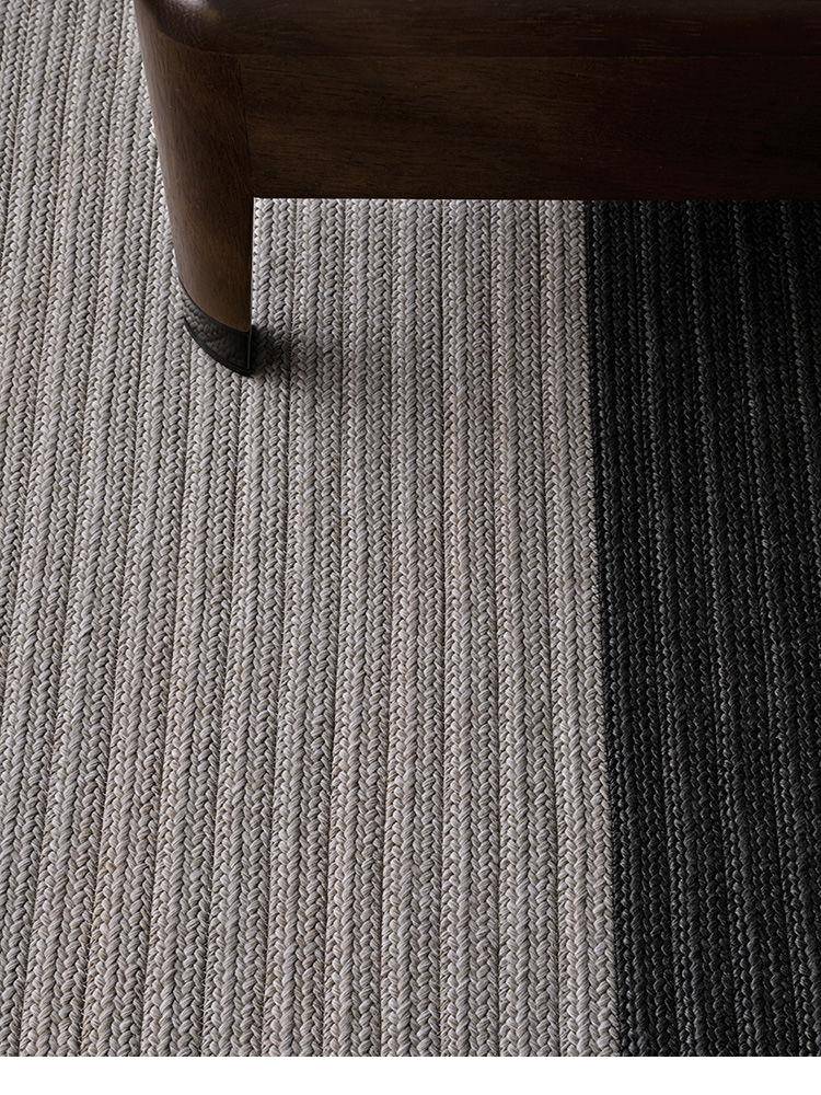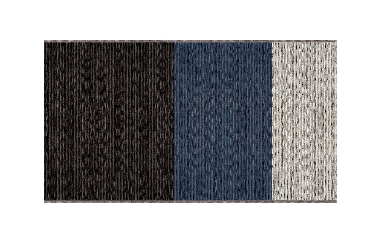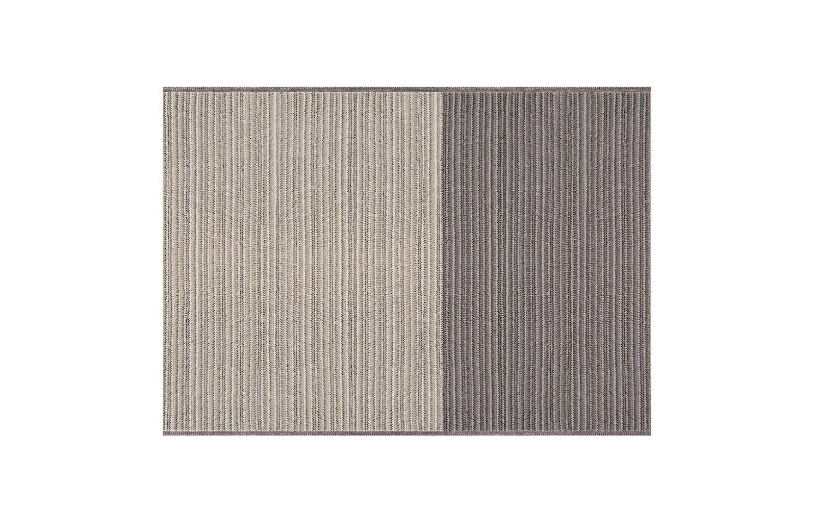 The rug has a plaited structure with a tricot effect, made of permeable, breathable acrylic yarn, making this rug truly ideal, even in humid environments. Durable, invisible stitching joins the mélange acrylic yarn plaits while the border on two sides is in a neutral grey.