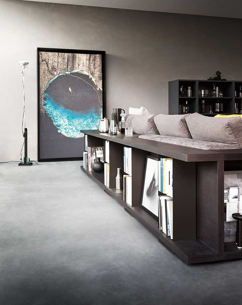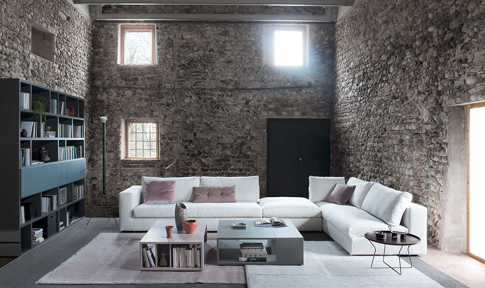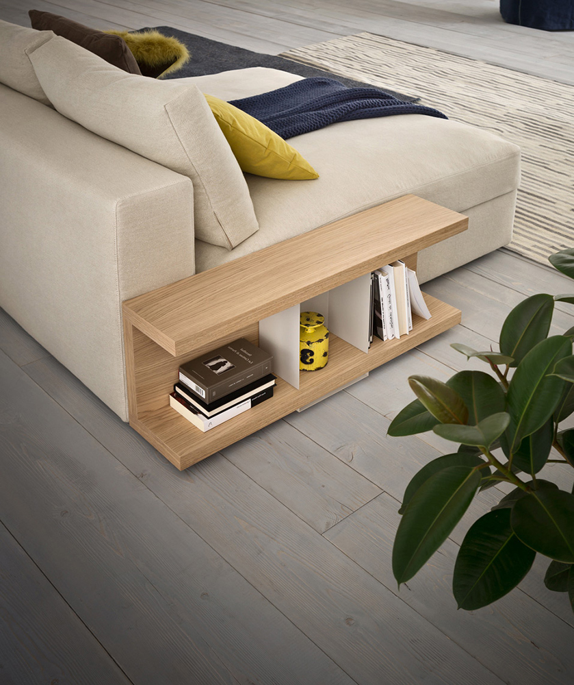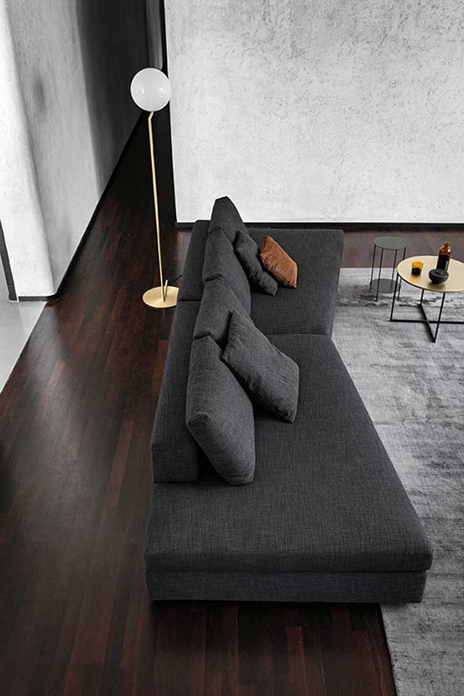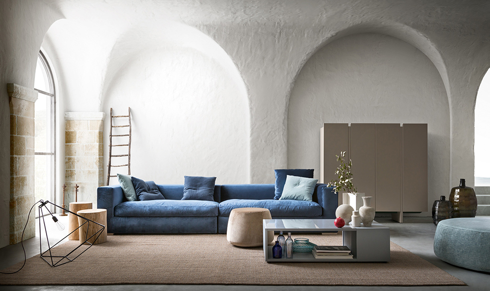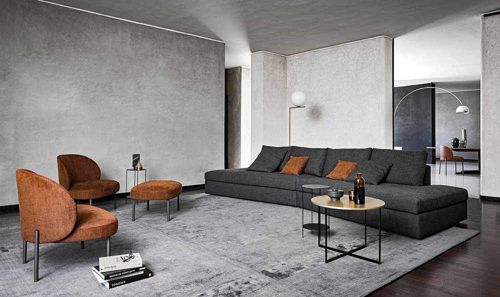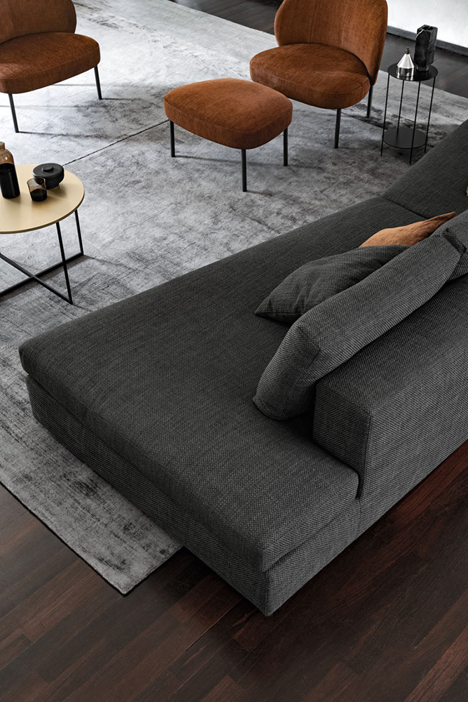 The CALIFORNIA sofa features lounge end units and modules that go beyond the idea of square right angles. They create convivial seating arrangements suitable for a less schematic and formal idea of a living room that is more open and welcoming.