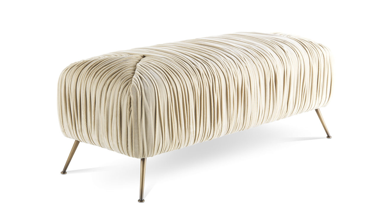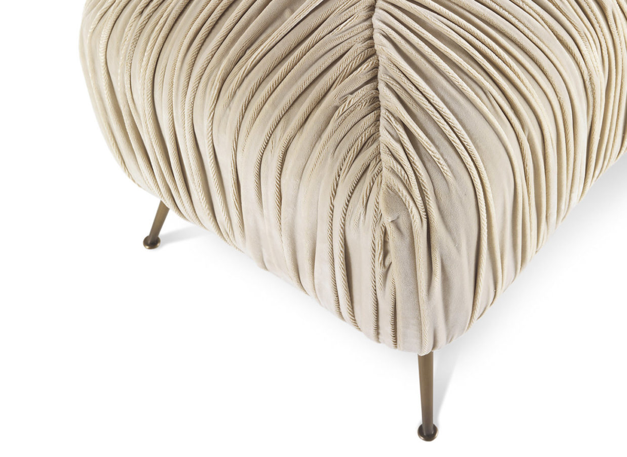 Versatile and original, Rowe pouf has brass feet which recall the Fifties and a special pleated padding with an original game of geometries resulting from the combination of trapezoidal shapes. The upholstery in thick velvet highlights the shapes of the pleating for a sophisticated and impactful result.