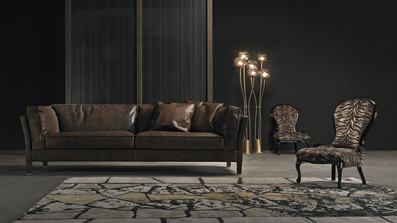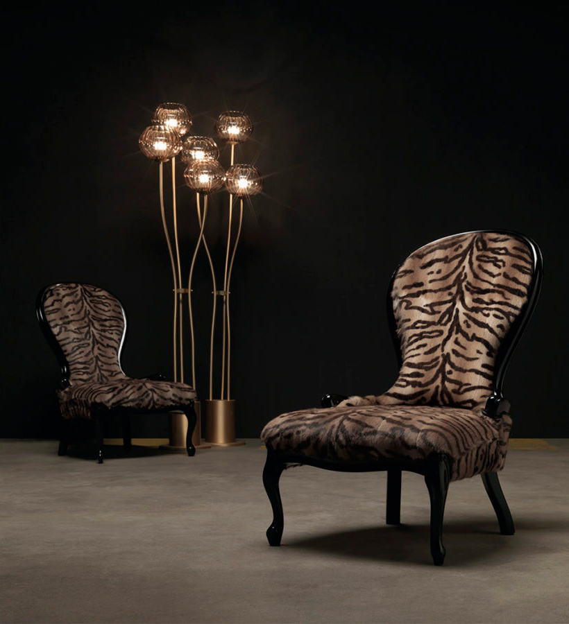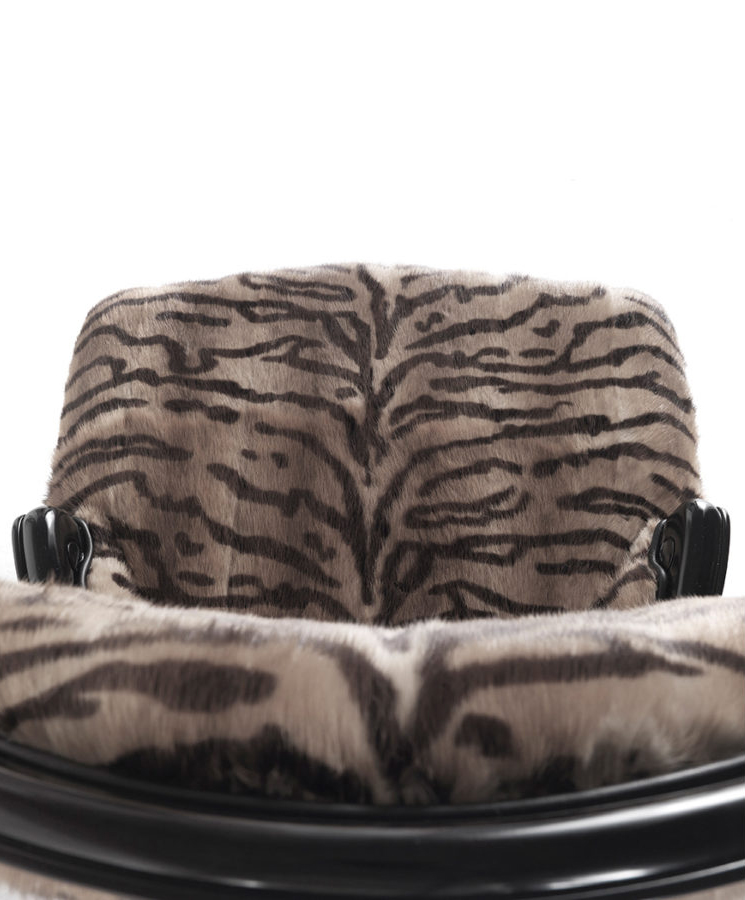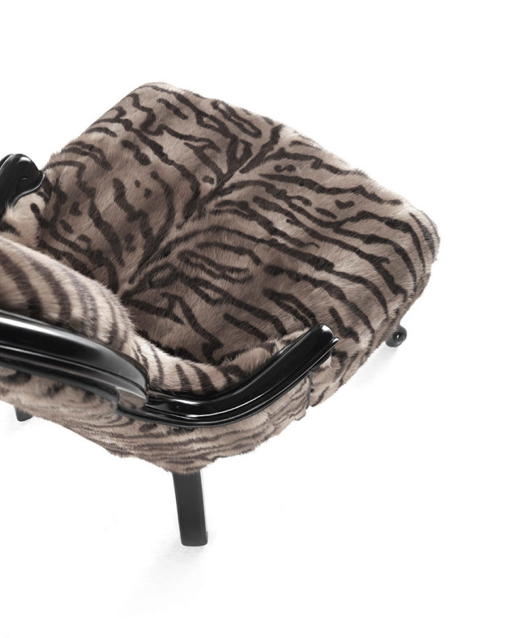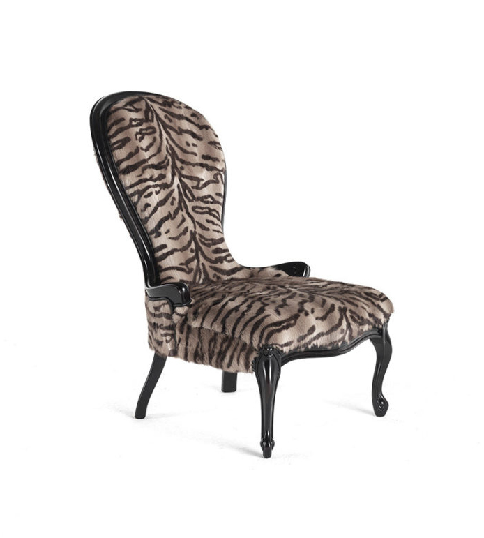 Լուի XV ոճի բազկաթոռ։ Կառուցվածքը՝ հաճարենու փայտ, փրփրապլաստ։ Պաստառապատումը՝ աքիսի մորթի՝ սև լաքապատ ծածկույթով։