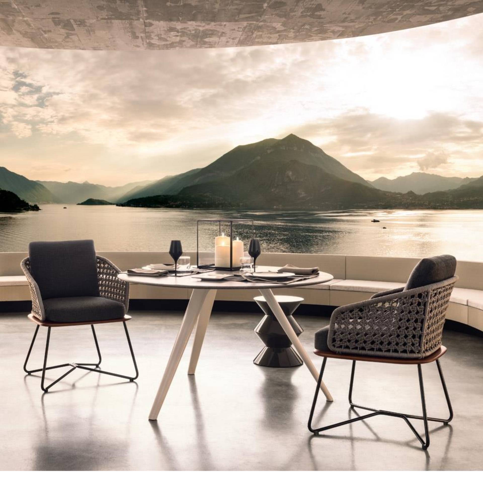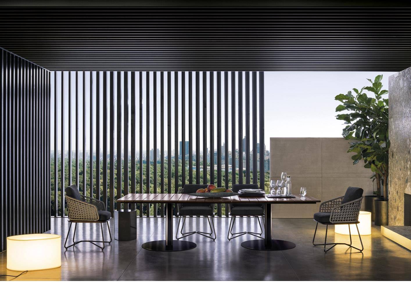 Rivera աթոռն իր կոմպակտ դիզայնով և նրբագեղ գծերով մարմնավորում է նախագծի բոլոր գեղագիտական արժեքները և նյութերի կատարյալ համադրությունը: Այն հենված է պտտվող անագի գույնի խողովակաձև մետաղական կառուցվածքի վրա, որը հատուկ մշակված է բացօթյա օգտագործման համար, ինչպես նաև անջրանցիկ մանրաթելով ծածկված փափուկ բարձիկների համար նախատեսված լցոնման նյութերը: