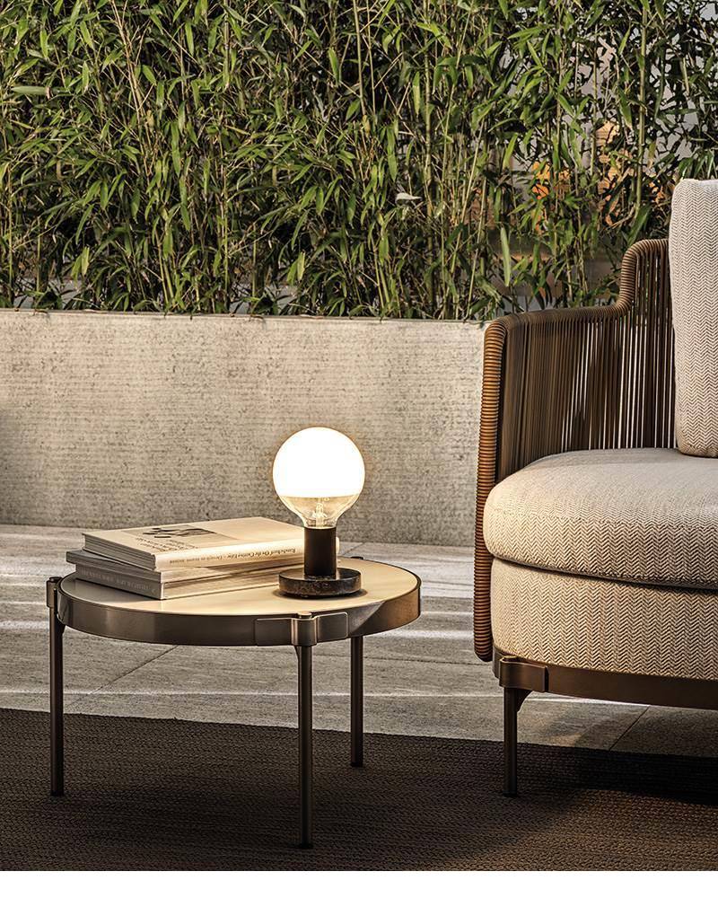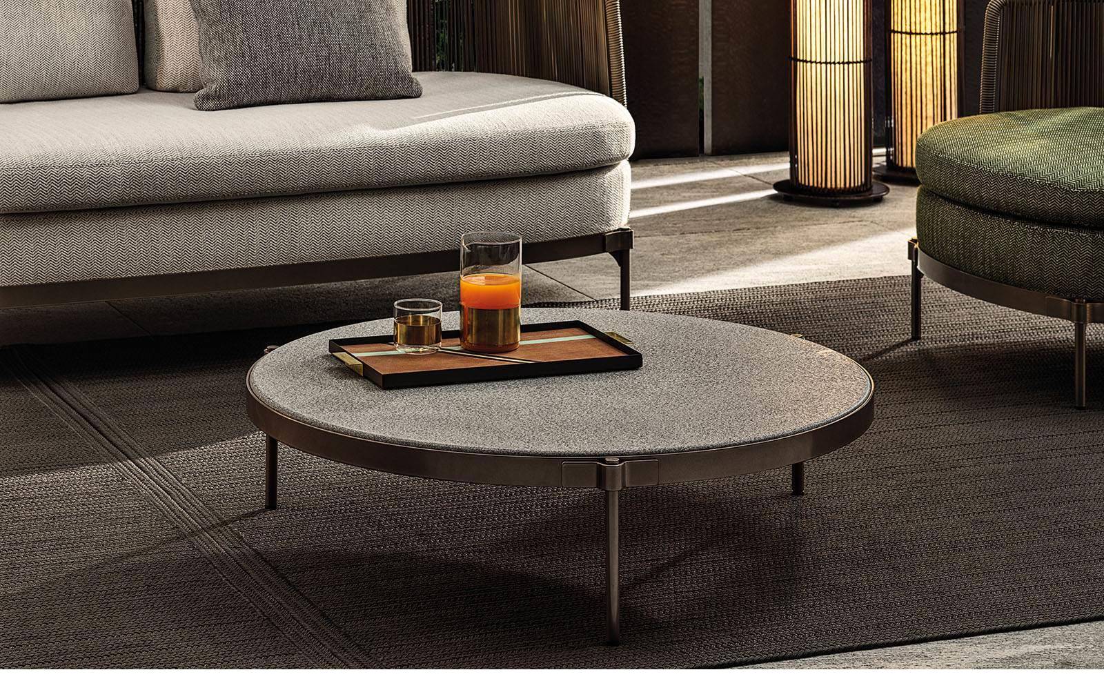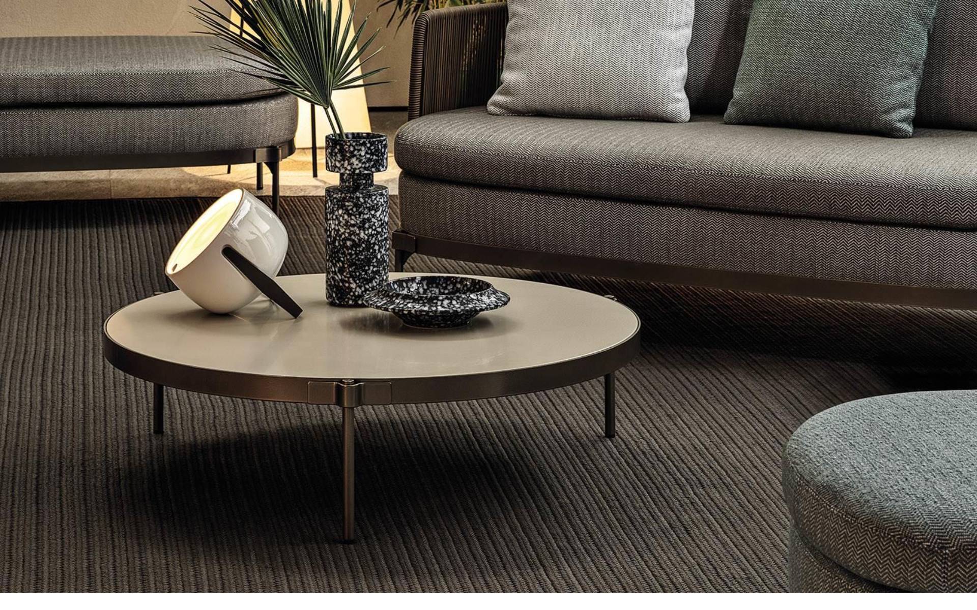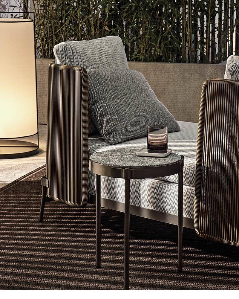 Թեթև բրոնզե ծածկույթով մետաղից փոքր սեղանների գաղափարը ոգեշնչված է Tape-ի բնորոշ դետալից, որը էսթետիկորեն ամրացնում է ոտքերը թագին, որի ներսում տեղադրված է Silver Beola կամ Corian EC վերնամասը: