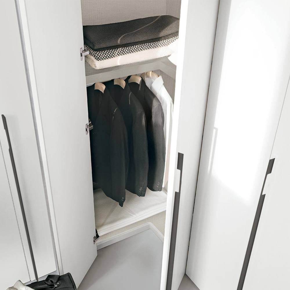 Անկյունային զգեստապահարան: Հագուստը կախելու համար զգեստապահարանն ունի անհրաժեշտ խողովակաձև նշաձողեր, ինչպես նաև իրերը դասավորելու տարողունակ դարակներ։