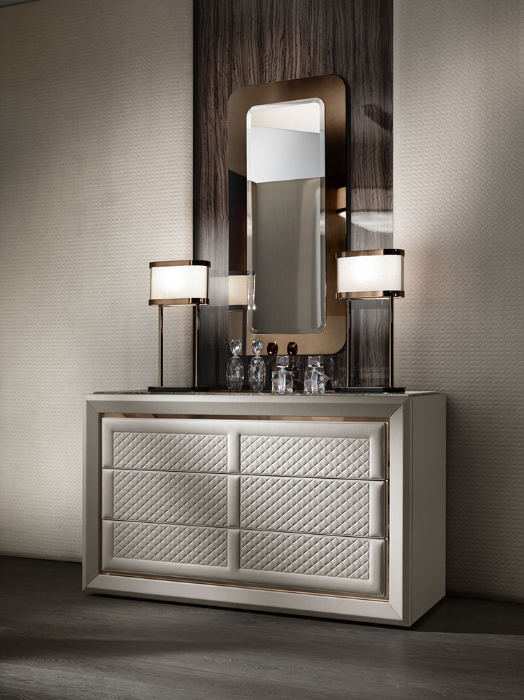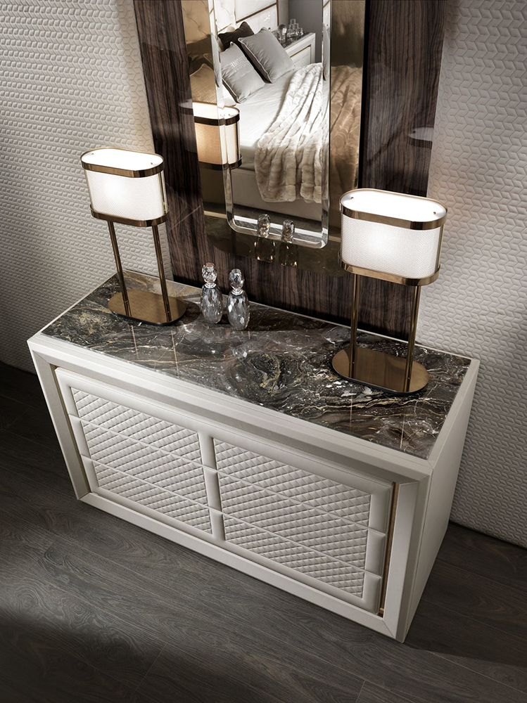 Բազմաշերտ կառուցվածք՝ պատված կաշվով։ Ներսից ծածկված է փայլատ լաքով։ Մետաղական ներդիրներ չժանգոտվող պողպատից: Սեղանածածկը մարմարից: Ծածկված առջևի push-pull համակարգ: