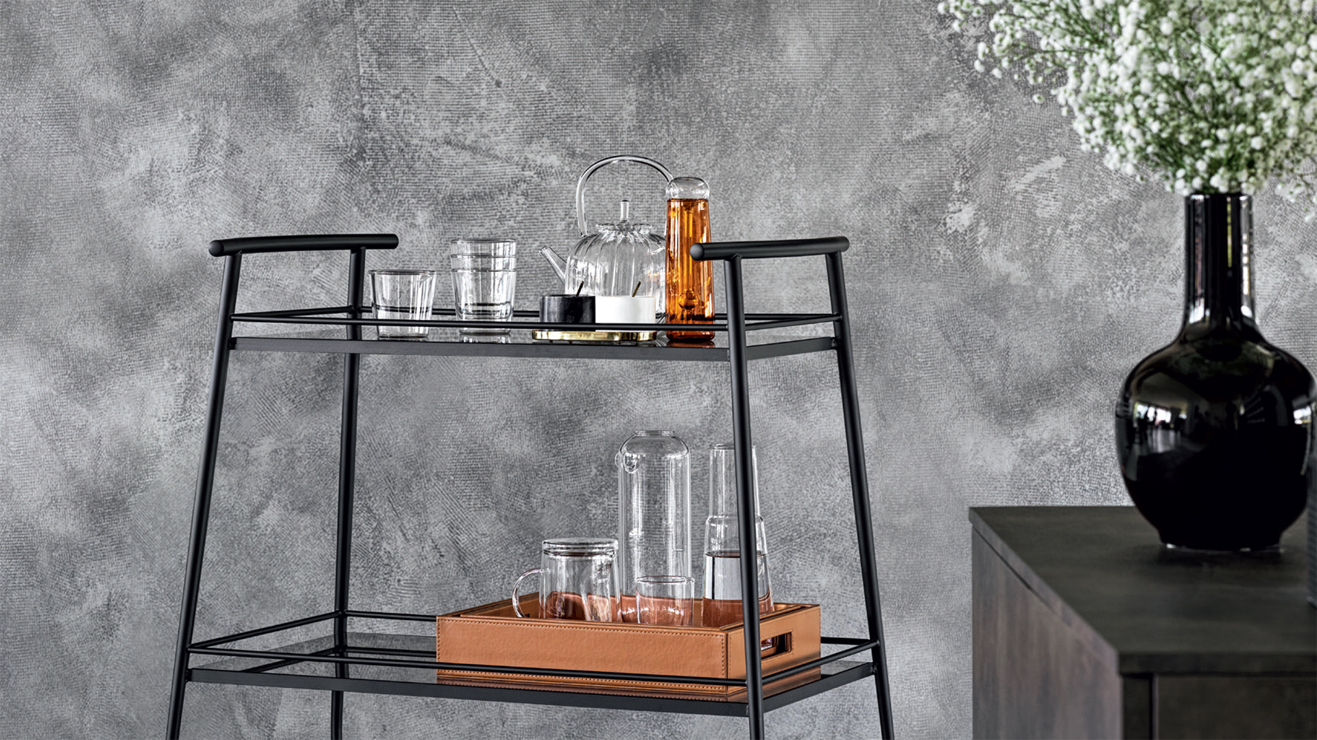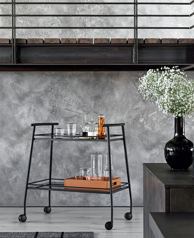 Сервировочный столик изготовлен из конической металлической трубы диаметром 18 мм с покрытием и двумя бронзовыми стеклянными полками. Благодаря тонкой раме и четырем поворотным колесам Love можно легко перемещать из комнаты в комнату.