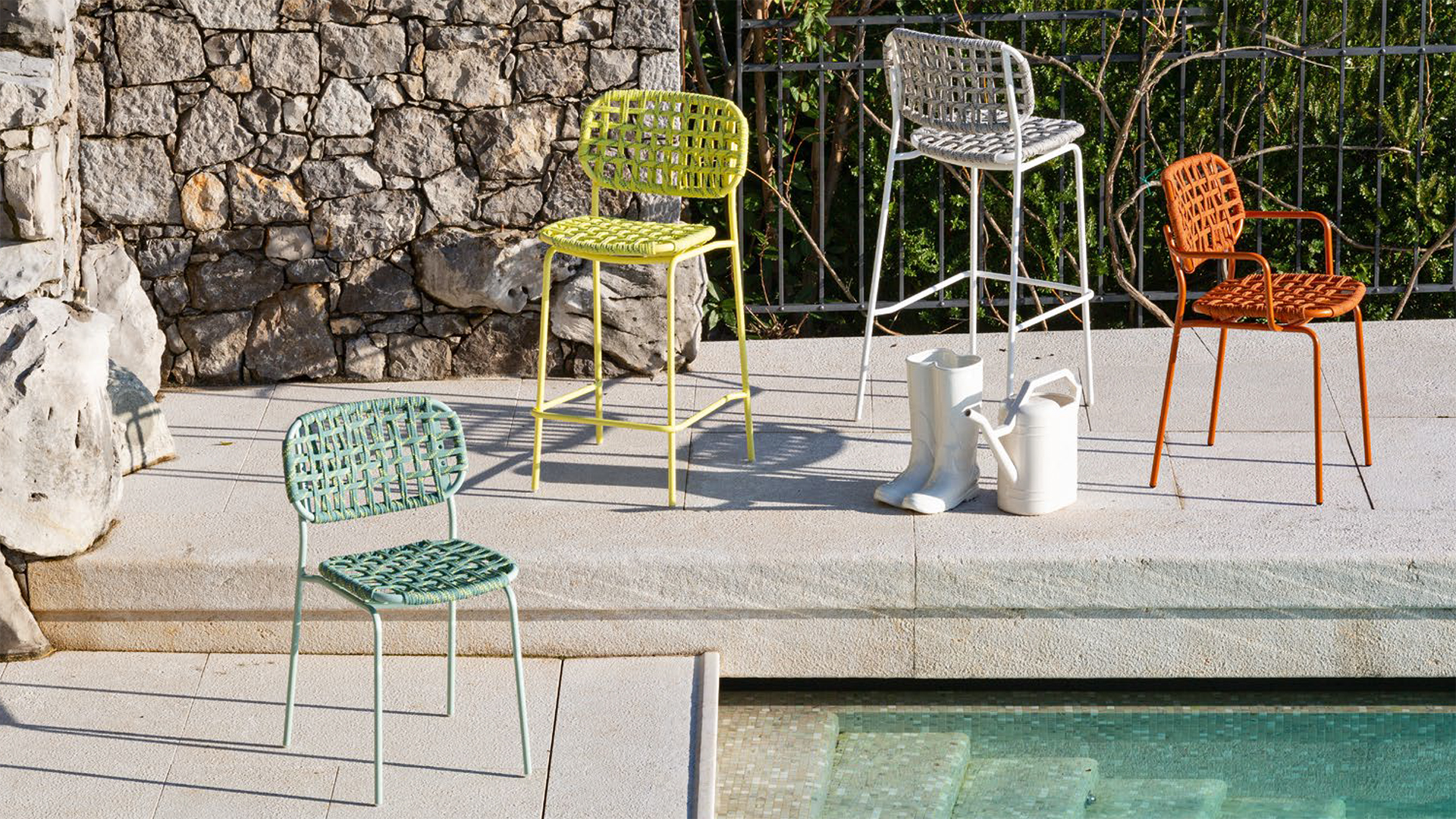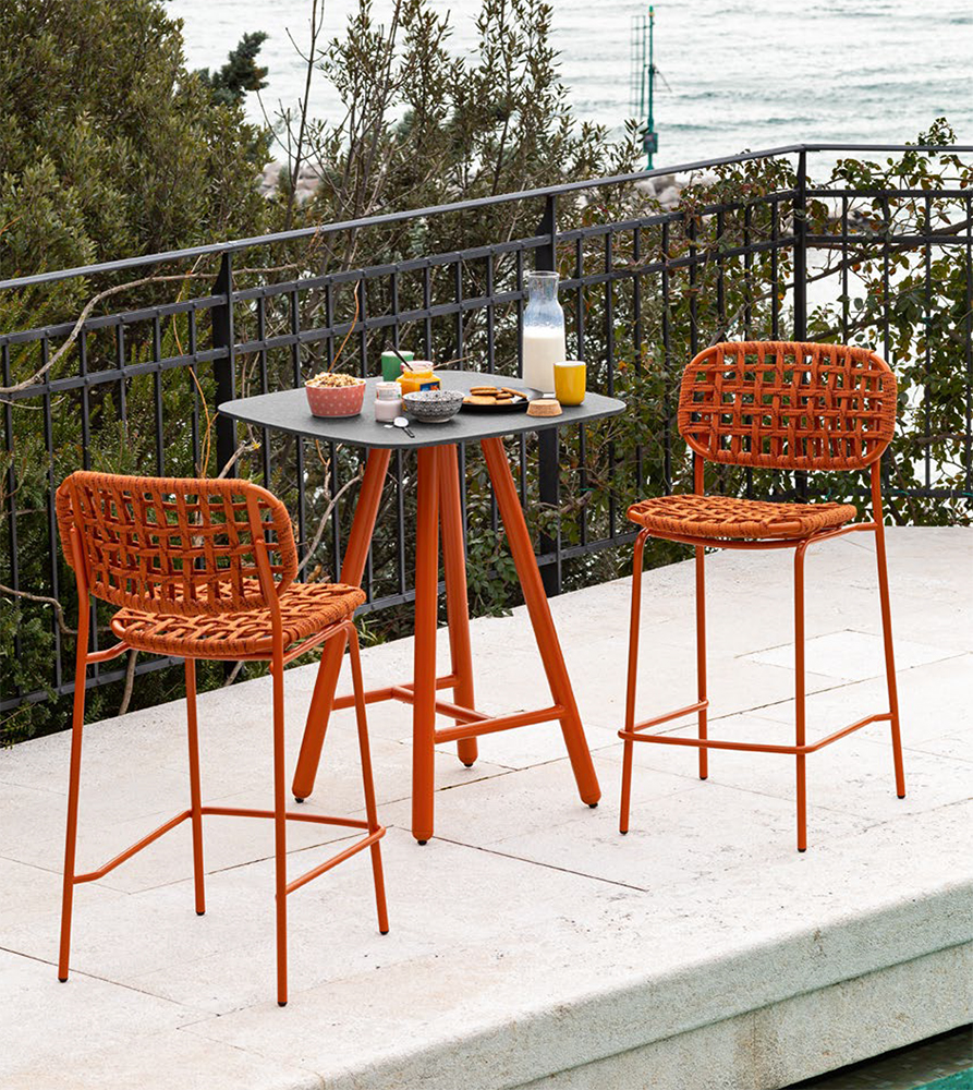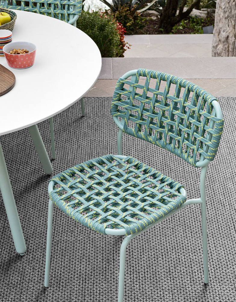 Спинка из литого пластика имеет декоративные крепежные вставки в цвет каркаса. Так же, спинка и сиденье могут быть изготовлены из плетёного, эластичного материала Tortuga.