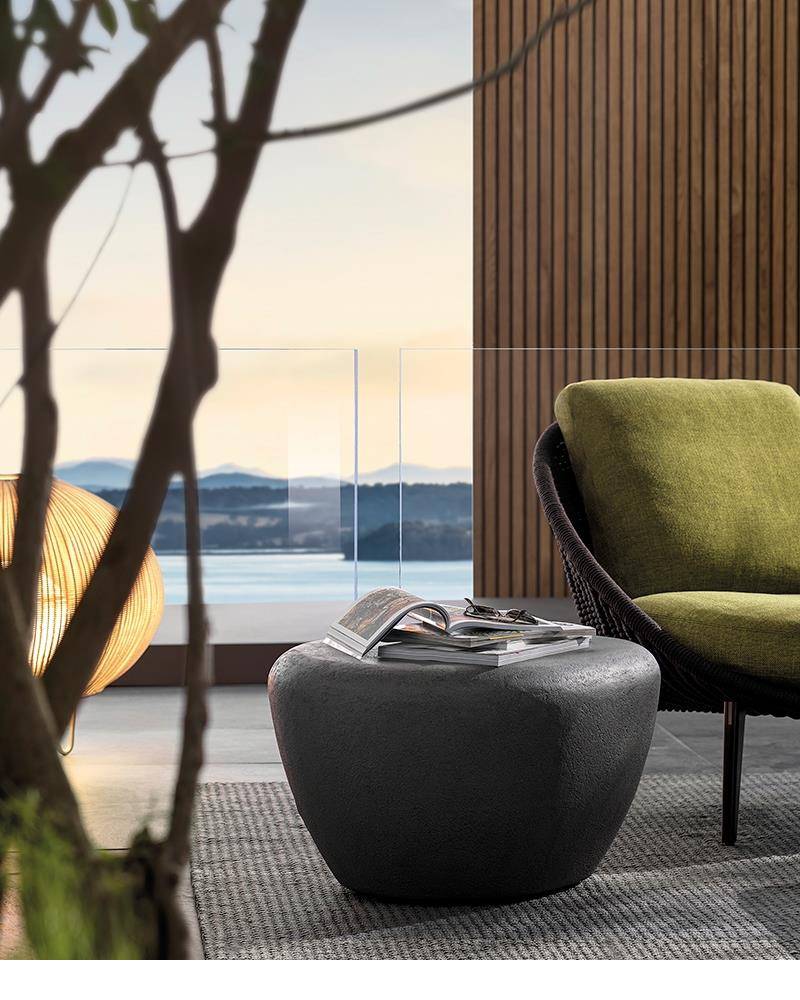 Stony — минималистичный кофейный стол, представлен в трёх размерах. Изделие, вдохновлённое формой камня-гальки, изготавливается из смолы с покрытием из каменного порошка. Модель подходит для размещения на открытом воздухе.