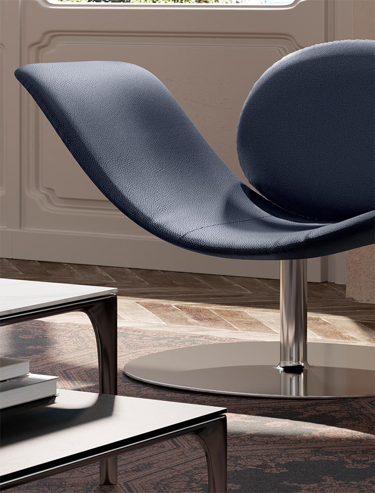 Лёгкое и динамичное кресло, вдохновленное силуэтом голубя. Dove имеет встроенный столик, ткань синий велюр. Доступен в качестве шезлонга и кресла, а также с практичным подносом из ясеня.